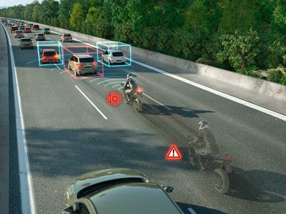 Deshalb wird der Fahrer zuerst optisch, akustisch oder auch haptisch (beispielsweise über Vibrationen im Lenker) vor einem Hindernis gewarnt und danach über einen geringen Vorbremsdruck beim Bremsprozess unterstützt. Erst wenn eine Reaktion des Piloten ausbleibt, bremst das System stärker, aber deutlich sanfter als beim Auto ab. Die Nah- und Fernbereichsradar-Sensoren sind übrigens so präzise, dass sie sogar kleinere Objekte wie einen abgefallenen Schalldämpfer auf der Fahrbahn erkennen können.