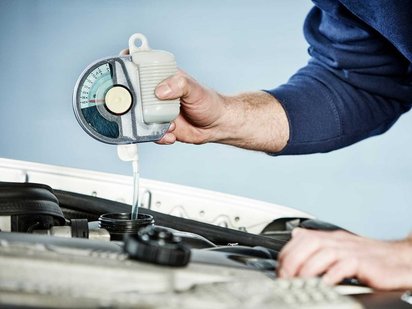 An die Tankstelle oder in die Werkstatt sollte man fahren, wenn es um die Kontrolle des Kühlerfrostschutzes geht. Mit einem Messgerät lässt sich feststellen, bis zu wie viel Minusgraden das Kühlsystem geschützt ist. Für mitteleuropäische Länder sind Werte von -25 °C bis -40 °C empfehlenswert. Vorsicht ist beim Einfüllen geboten: Das Kühlsystem steht unter Druck. Der Deckel darf nur bei kaltem Motor geöffnet werden, sonst drohen durch die herausschießende heiße Flüssigkeit gefährliche Verbrennungen.