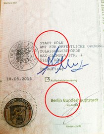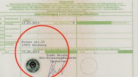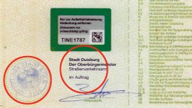 Die bei Diebstählen in Straßenverkehrszulassungs-Behörden gestohlenen Blanko-Dokumente weisen immer Aufdrucke des jeweiligen Straßenverkehrsamtes auf. Die Ortsbezeichnungen von Stempel (hier Stadt Köln) und Aufdruck (hier Stadt Duisburg) dürfen sich aber nicht unterscheiden.