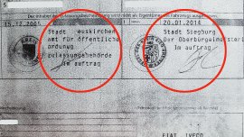 Aus Unkenntnis verwenden Fälscher manchmal auch ausgedachte oder falsche Behördennamen. So unterscheidet sich auf dieser Fälschung das Amt für öffentliche Ordnung von der Kfz-Zulassungsstelle. Auch stimmen hier Stempel, Behördenangaben und Straßenverkehrsämter nicht überein.