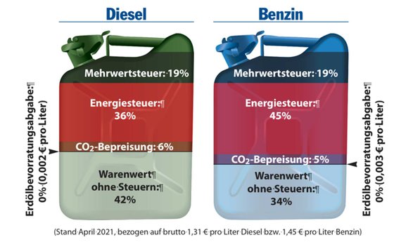 Verglichen mit unserem Beispiel aus dem April 2021 bei einem Bruttoverkaufspreis von 1,45 bzw. 1,31 Euro (siehe Grafik) bedeutet das circa 1,4 bzw. 1,5 Cent mehr. Hinzu kommt, dass der Rohölpreis stark schwankt. Dieser ist in unserer Grafik in dem Punkt „Warenwert“ enthalten, ebenso wie die Kosten für Exploration, Verarbeitung und Transport. Der Rohölpreis ist abhängig von Konjunktur, politischer Lage und Jahreszeit. Auch der aktuelle Dollarkurs hat Auswirkungen darauf, da Öl weltweit in der US-amerikanischen Währung gehandelt wird. Steigt der Dollarkurs im Verhältnis zum Euro, erhöhen sich auch die Preise an der Zapfsäule. Und welche Kosten stecken noch im Spritpreis? Die Mehrwertsteuer von 19 Prozent, die Energiesteuer (ehemals Mineralölsteuer) und die Erdölbevorratungsabgabe.