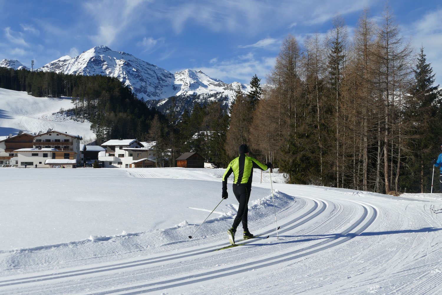 Die Sonnenplateau-Loipe ist das Herzstück des Ötztaler Langlaufzentrums in Niederthai, das mit dem Tiroler Loipen-Gütesiegel ausgezeichnet wurde. Die drei Kilometer lange blaue – also leichte – Hauptrunde kann mit drei schwierigeren Extra-Schleifen kombiniert werden. Auch wir nutzen sie, um die von vielen Langläufern gefürchtete Abfahrt zu üben. „Die Rückenlage ist unser größter Feind“, warnt Michael Leiter und schärft uns ein, in die Knie zu gehen, den Oberkörper nach vorne zu beugen und die Stöcke am Körper zu halten. „Wichtig ist es, vorausschauend und kräftesparend zu fahren sowie die richtige Technik am richtigen Punkt einzusetzen“, erläutert unser Langlauflehrer. Um den Schwung aus der Abfahrt mitzunehmen, empfiehlt sich etwa der Doppelstockschub, bei dem sich der Läufer in Kniehaltung mit den Stöcken auf Bindungshöhe abstößt, den Oberkörper vorbeugt und die Stöcke bis zu den Hüften nach hinten schwingt.