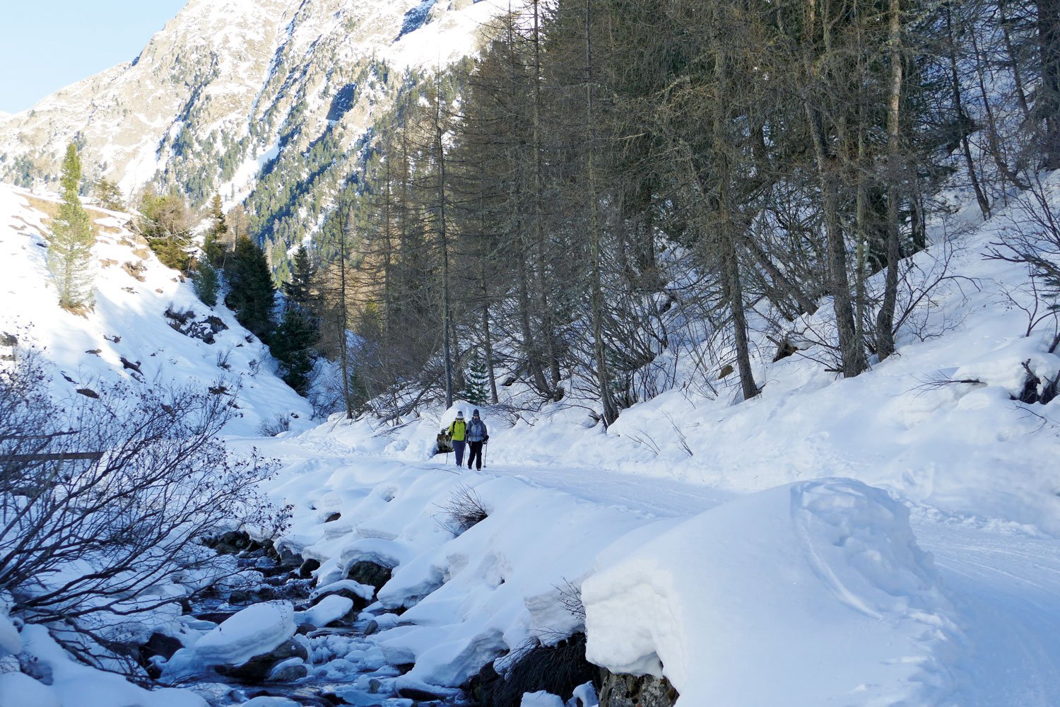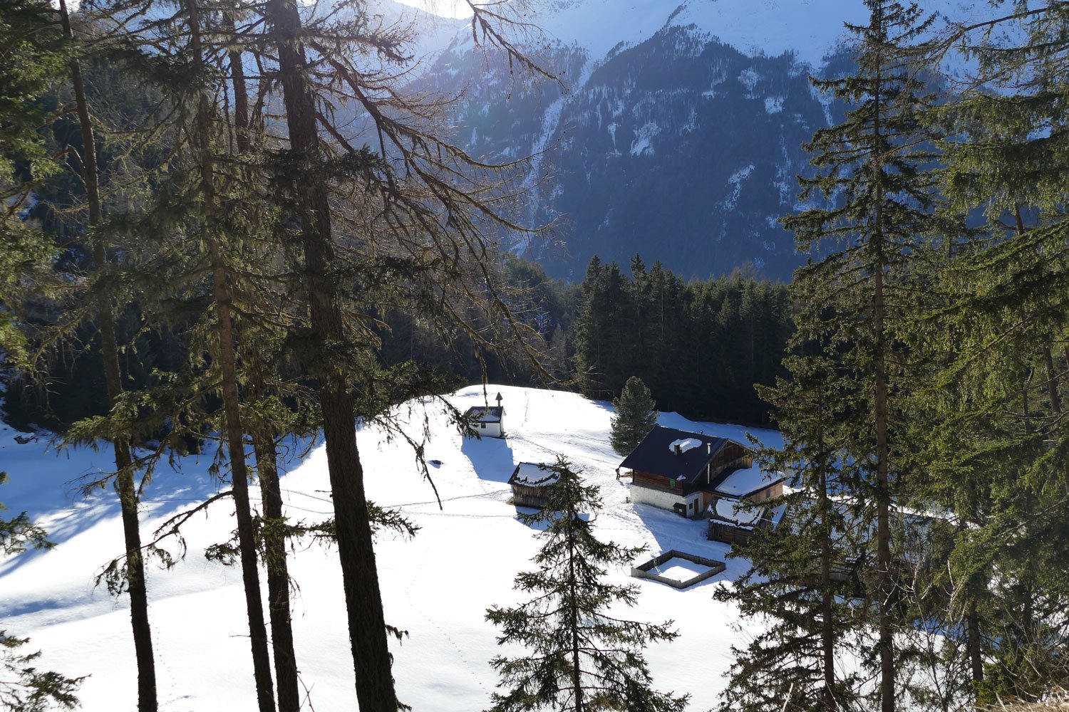 Ein Angebot, das allen Gästen offensteht, sind Winterspaziergänge rund um den Ort. In rund 50 Minuten geht es etwa zur Larstigalm. Der leicht ansteigende Weg führt immer am wild rauschenden Horlachbach entlang. Schneebedeckte Gesteinsbrocken und Bäume flankieren ihn bis zu einer kleinen Kapelle, hinter der die Alm liegt. Hier wärmen wir uns bei Suppe, Strudel und dem obligatorischen Schnapserl auf, bevor die Rückfahrt ansteht. Für die stellt der Wirt gegen eine Gebühr von drei Euro Schlitten zur Verfügung. Und so düsen wir die dreieinhalb Kilometer nach Niederthai auf Rodeln hinab. Der Fahrtwind lässt die Augen tränen, der Schnee staubt uns ins Gesicht, und wir fühlen uns wieder wie Kinder. Unten am Rodeldepot der Larstigalm trennen wir uns nur ungern von dem nostalgischen Transportmittel.