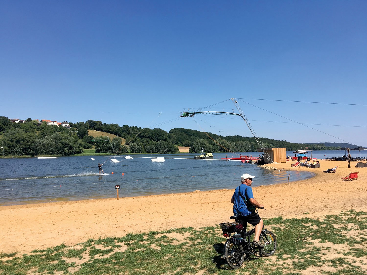 Wesentlich leichter geht mir aber das Wasserskifahren von der Hand. Hier heißt es einfach in die Knie gehen, dem Zug des Seiles folgen, ins Wasser gleiten und losdüsen. Ich drehe problemlos mehrere Runden – nur dort, wo der Zug auf dem Seil kurz nachlässt und wieder anzieht, heißt es aufpassen. Andererseits sind diese Stellen wichtig für den Ausstieg: Bei reduziertem Tempo lasse ich die Hantel einfach los, gleite ins Wasser, löse die Ski und wate zum Ufer.