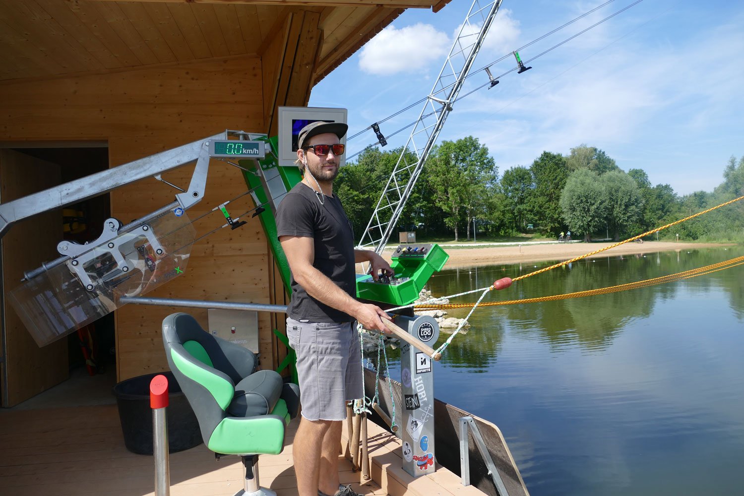 Beim Schnupperkurs auf der neuen Anlage hat heute Marc Berthold das Kommando. Trotz des lässigen Umgangstons lässt der Wakepark-Manager keinen Zweifel daran, dass Sicherheit für ihn an erster Stelle steht. Nachdem die Neoprenanzüge sitzen und alle barfuß sind, verbannt er Glasflaschen aus dem Startbereich, damit sich niemand verletzt. „Wenn ihr stürzt, greift zuerst das Brett und schiebt es weg, bevor ihr auftaucht, um euch nicht zu stoßen“, mahnt Marc. „Dann verlasst an der nächstmöglichen Stelle das Wasser. Wer oben bleibt, folgt immer in der Umlaufbahn und kommt anderen nicht in die Quere“, fügt er hinzu.