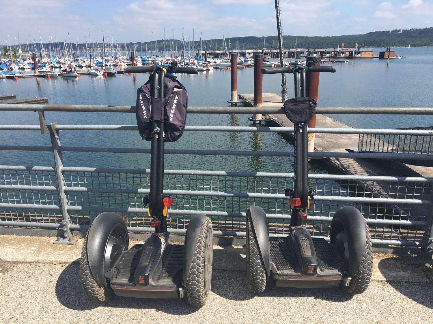 Gemeinsam mit den Gästen vom Sonnenhof haben wir heute ein Ziel: Wir möchten uns auf der Segway-Tour einen Überblick über den östlichen Teil des Großen Brombachsees verschaffen. Doch bevor es soweit ist, erteilt uns Petra einen Grundkurs in der Handhabung der Elektro-Fahrzeuge. Wichtig dabei: Das Anfahren wird nicht durch Druck der Arme auf den Lenker, sondern durch Vorwärtsbeugen des gesamten Körpers ausgelöst. „Je nachdem, wie viel Gewicht ihr so auf eure Fußballen bringt, erhöht oder reduziert ihr die Geschwindigkeit“, erklärt Petra. Jetzt noch die Arme zum Lenken nach links oder rechts schwenken, und schon drehen wir auf dem Hotelparkplatz unsere ersten Runden. Petra lässt uns noch ein paar schwierigere Situationen wie das Bergauf- und Bergabfahren trainieren, dann stellt sie die Segways vom Übungsmodus (12 km/h) auf die regulären 20 km/h Höchstgeschwindigkeit um.