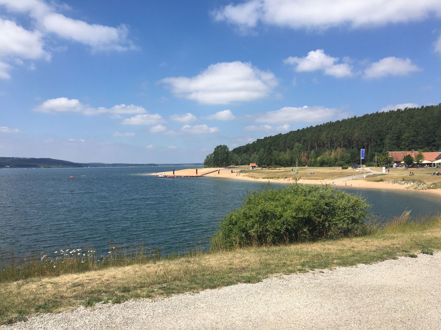Am südlichen Seeufer entlang fahren wir wieder Richtung Pleinfeld und passieren den Heimathafen der MS Brombachsee, eines beliebten Ausflugskatamarans. Am Strandhaus West blicken wir auf die schattigen, ruhigen Badestellen von Pleinfeld Wald. Der typische rötliche Sand begegnet uns auch wenig später wieder, als hinter dem großen Damm der Strand von Allmannsdorf auftaucht. Bevor der erreicht ist, biegen wir aber zur idyllischen Mandlesmühle ab, wo heute neben dem Wasserwirtschaftsamt ein Infozentrum zur Geschichte des Seenlandes untergebracht ist.