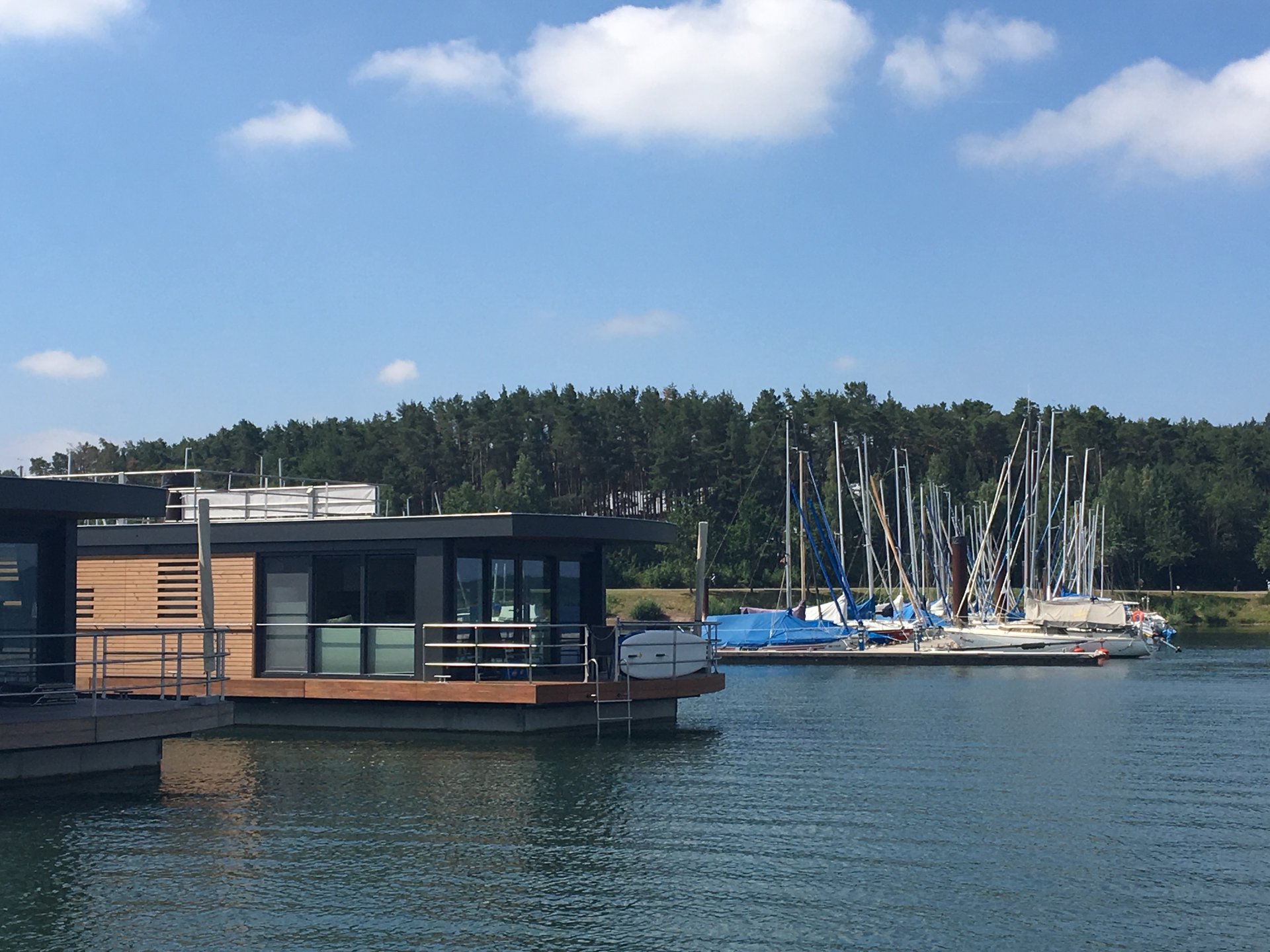 In flottem Tempo drehen wir nun zunächst eine Runde durch den Ort Pleinfeld, vorbei am Freibad und dem Naturfreundehaus, bevor es oberhalb der Teiche auf einem längeren Streckenabschnitt nach Ramsberg geht. Dort genießen wir nicht nur den Blick auf den See und den Yachthafen, sondern entdecken auch eine weitere innovative Unterkunftsform: das Floating Village, einen schwimmenden Ferienhauspark mit 18 Wohneinheiten. Weil gerade die Reinigungskräfte aktiv sind, dürfen wir einen kurzen Blick in eines der 45 Quadratmeter großen Domizile werfen. Mit einem Schwedenofen im Wohnraum, zwei Schlafzimmern und einer Dachterrasse wirkt es sehr einladend. Entsprechend groß war der Ansturm auf die Ende 2018 eröffnete Anlage in der vergangenen Saison.