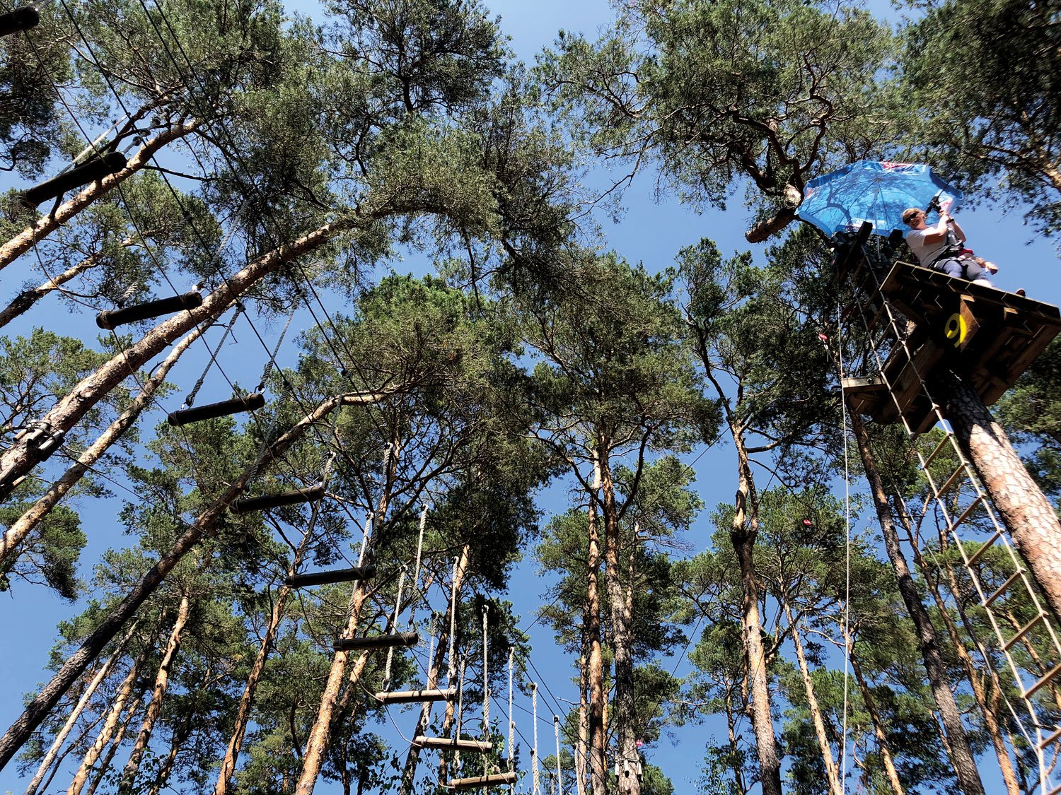 Auch wer auf der Suche nach einem Adrenalinkick ist, wird im Fränkischen Seenland fündig. Zum Beispiel im Abenteuerwald Enderndorf, wo eine rasante Seilabfahrt über den Igelsbachsee führt. Die Traverse ist der krönende Abschluss eines etwa dreistündigen Hochseilparcours durch einen lichten Mischwald. Zum Finale wird der Puls des Kletterers noch einmal ordentlich in die Höhe getrieben: Um auf den Startturm zu gelangen, muss er eine zunächst schräge, dann senkrechte Leiter hochsteigen – für Menschen mit Höhenangst eine Herausforderung. Zum Glück hat das Team vom Abenteuerwald alles im Griff. Oben hakt ein Mitarbeiter den Überquerer schnell am Klettergurt in die Zip-Line ein, lässt sich per Funkgerät das OK von der Gegenseite geben und schickt ihn auf die 560 Meter lange Fahrt, bei der ein Höhenunterschied von 36 Metern überwunden wird. Unter Drehungen saust man über den See und nimmt aus den Augenwinkeln das Winken der Bootsfahrer unter einem wahr. Viel zu schnell wird der Traum vom Fliegen mit einer unsanften Landung auf einer hackschnitzelgepolsterten Rampe beendet. Per Boot geht es zurück zum anderen Ufer.