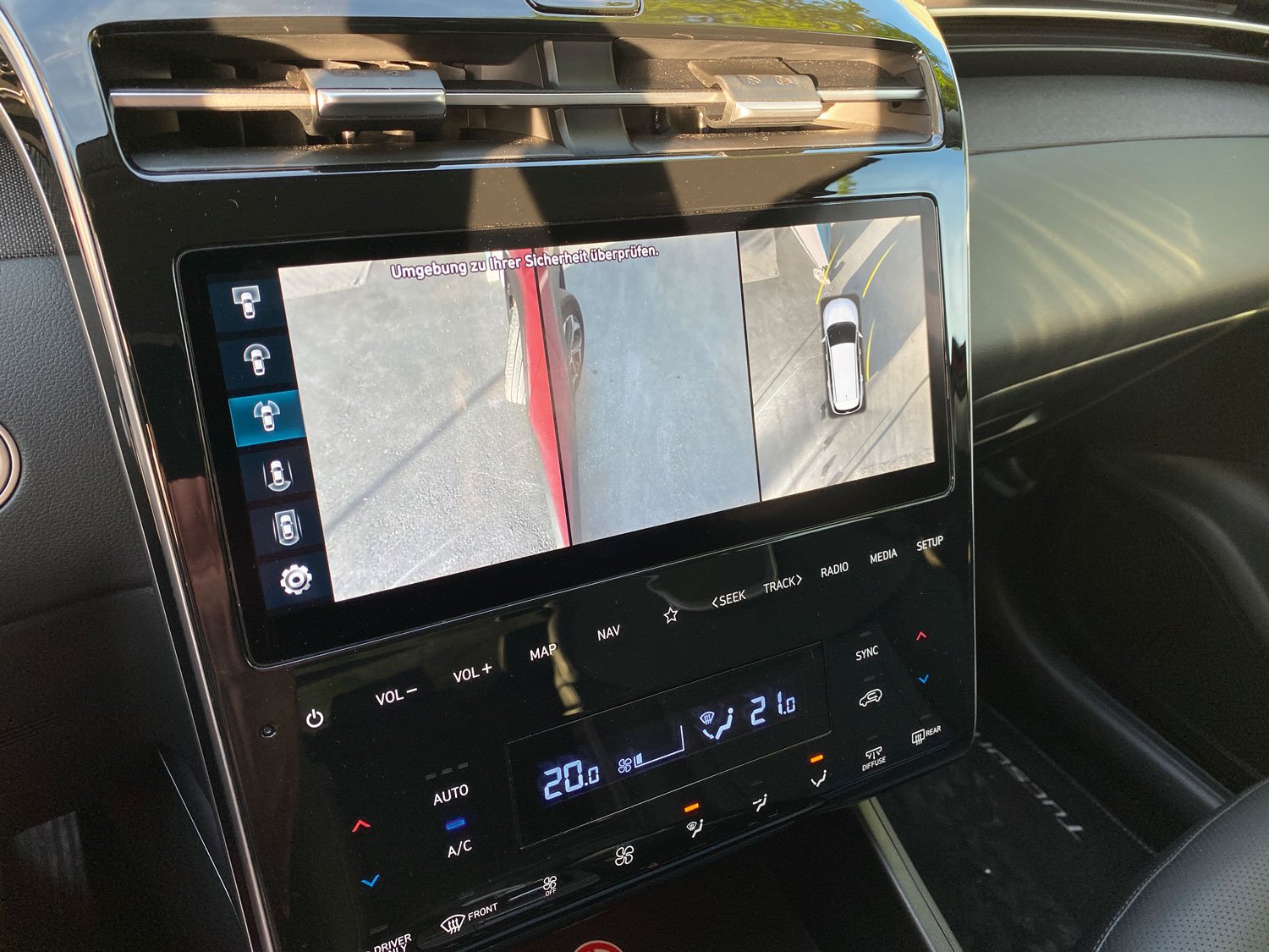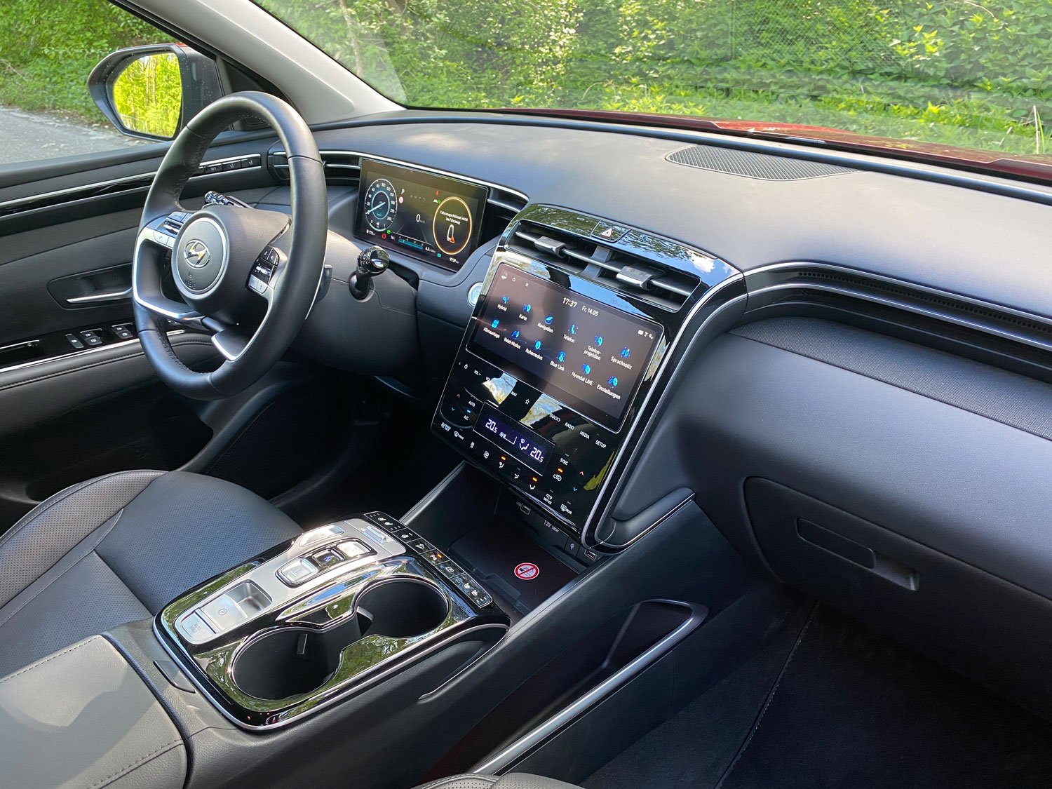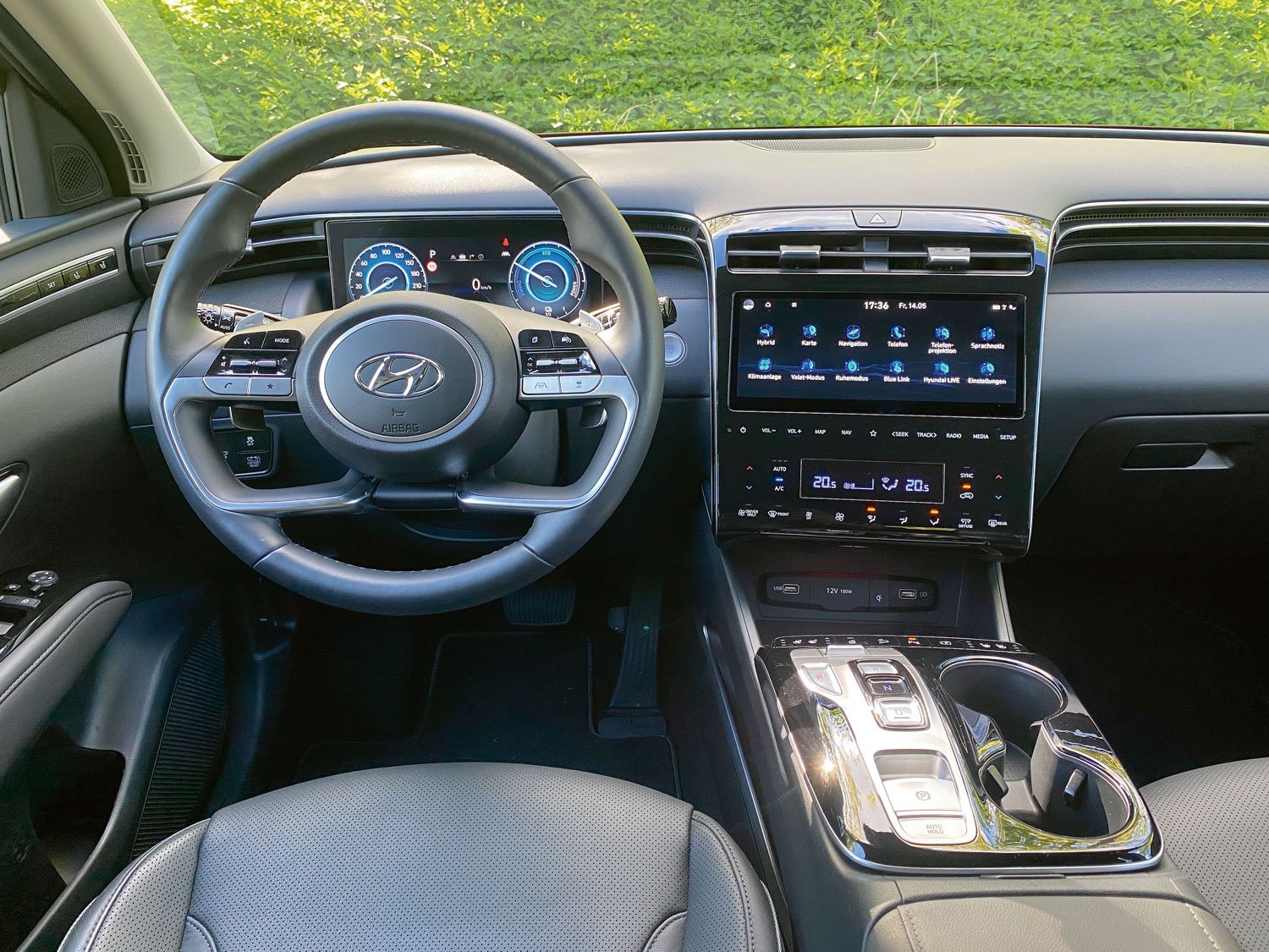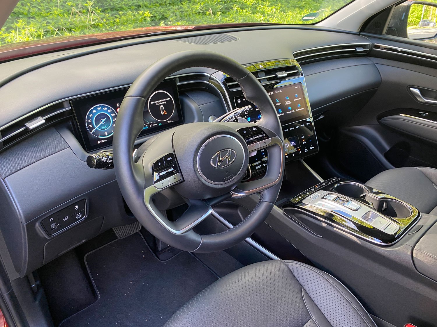 Bereits in der Basis-Ausstattung Pure ist der Tucson ab 26.800 Euro reichhaltig ausstaffiert. Prall gefüllt mit allerhand elektrischen und assistierenden Helfern stand unser Testwagen in der vierten und damit höchsten Ausstattungsstufe Prime bereit. Elektrische Heckklappe, Drei-Zonen-Klimaautomatik, Sitzheizung vorne und hinten, Belüftung der Ledersitze vorne, Ausstiegswarner und Querverkehrswarner hinten sind nur ein kleiner Ausschnitt aus der langen Liste. Außerdem eröffnet Prime die Möglichkeit zu weiteren Optionen. Eine Empfehlung wert ist das Sicherheitsanzeige-Paket für 500 Euro. Es ermöglicht vom Fahrersitz aus in verschiedenen Perspektiven den kamerabasierten Blick rund ums Auto, dargestellt auf dem Monitor der Mittelkonsole. Eine sinnvolle Hilfe, denn trotz großer Fensterflächen ist der Blick nach hinten links und rechts durch die breiten C-Säulen erschwert. Außerdem in diesem Paket mit dabei ist die kamerabasierte Einblendung des toten Winkels im digitalen Cockpit. Entweder anstelle des Tachos oder des Drehzahlmessers, je nachdem, ob der Blinker links oder rechts gesetzt ist.