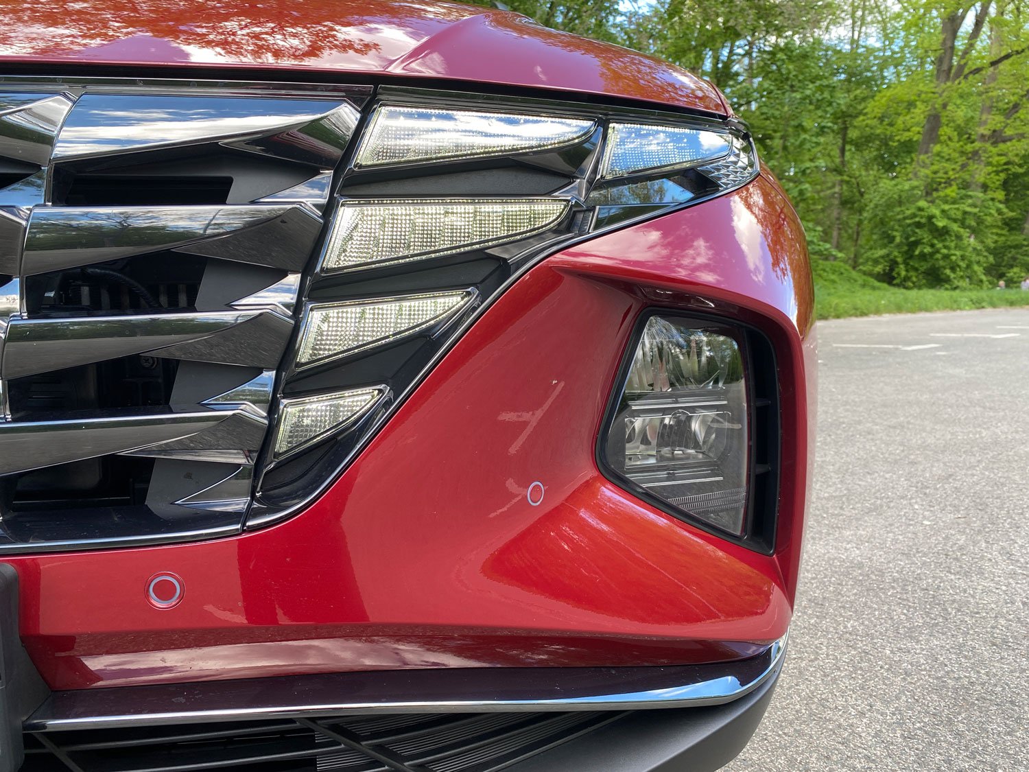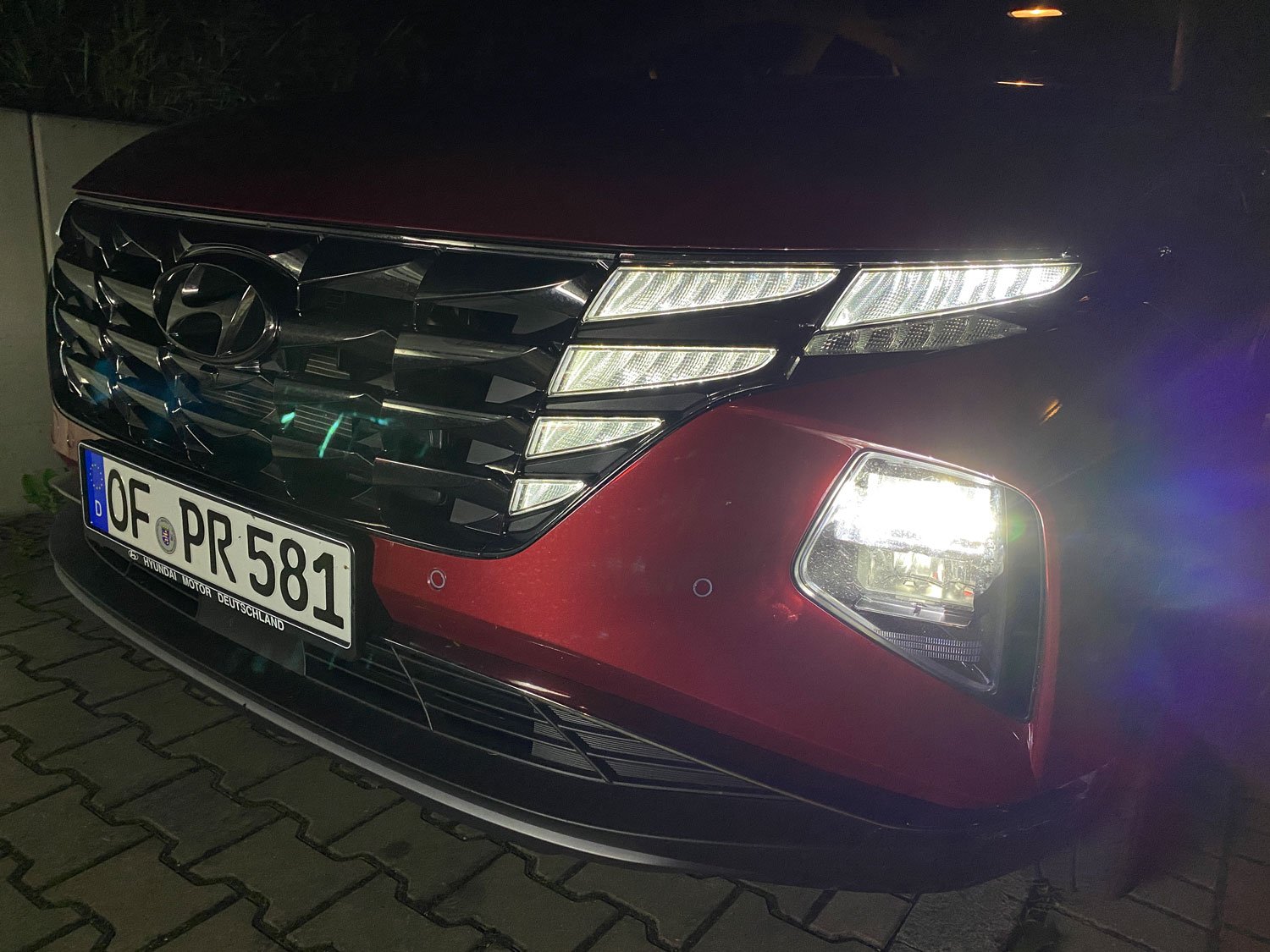Dieser Kühlergrill des Hyundai Tucson hat schon was. Erinnert er in seiner Machart doch entfernt an das Stadion, in dem der amtierende Deutsche Fußballmeister seine Heimspiele austrägt. Zumal einige Elemente als Tagfahrlicht leuchten, so wie es die Außenhaut der spektakulären Sportarena im Münchener Stadtteil Fröttmaning auch vermag.