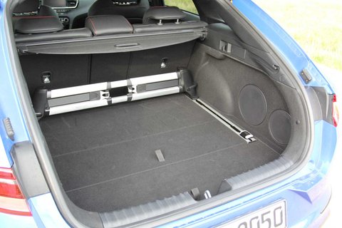 Und davon passt in den Kofferraum mehr als gedacht. Mit 594 Litern Volumen fehlen ihm zum Ceed SW auf dem Papier nur noch 31 Liter, doch das fällt im vollgeladenen Zustand nicht auf. Zur Standardausstattung im Proceed gehören unter anderem ein einfach bedienbares Gepäckraumtrennsystem auf Schienenbasis sowie ein Gepäcknetz und Ablagefächer im Kofferraumboden zum Verstauen von Kleinteilen. In der höchsten Ausstattungsstufe GT (nur mit 150 kW/204 PS) wie bei unserem Testwagen, ist die elektrische Heckklappe serienmäßig vorhanden. Was aber durchaus als gewöhnungsbedürftig auffällt, ist das eingeschränkte Sichtfeld nach hinten durch das nach unten gezogene Dach. Hinterherfahrende Autos tauchen erst wenige Meter hinter dem Fahrzeug im Innenspiegel auf. Bei Nässe hält der Heckwischer zudem nur ein kleines Sichtfeld frei – ein Hoch auf die großen Außenspiegel. Auch die weit nach hinten gezogenen D-Säulen erschweren die Sicht, glücklicherweise hilft eine serienmäßige Rückfahrkamera beim Rangieren.