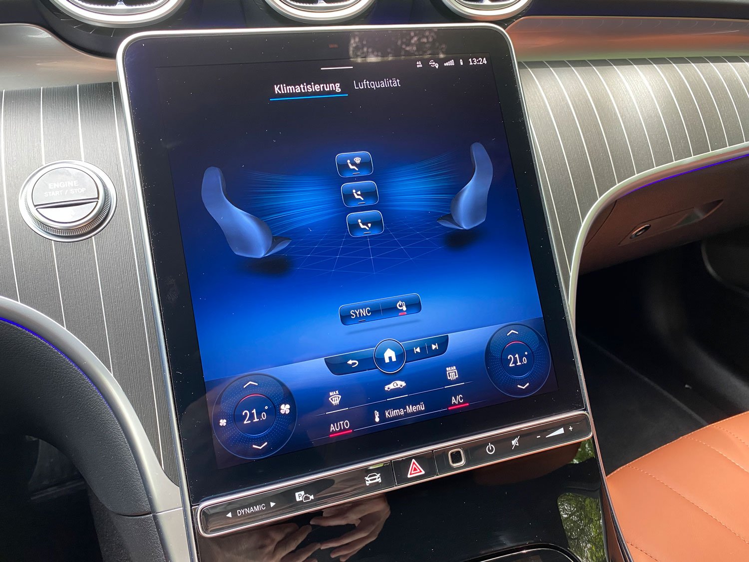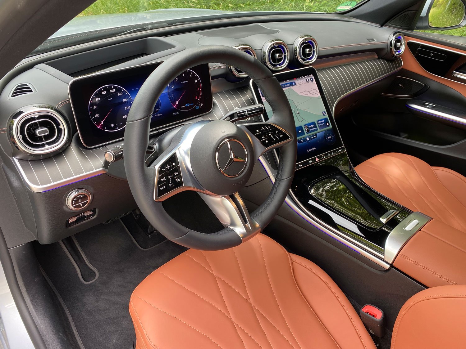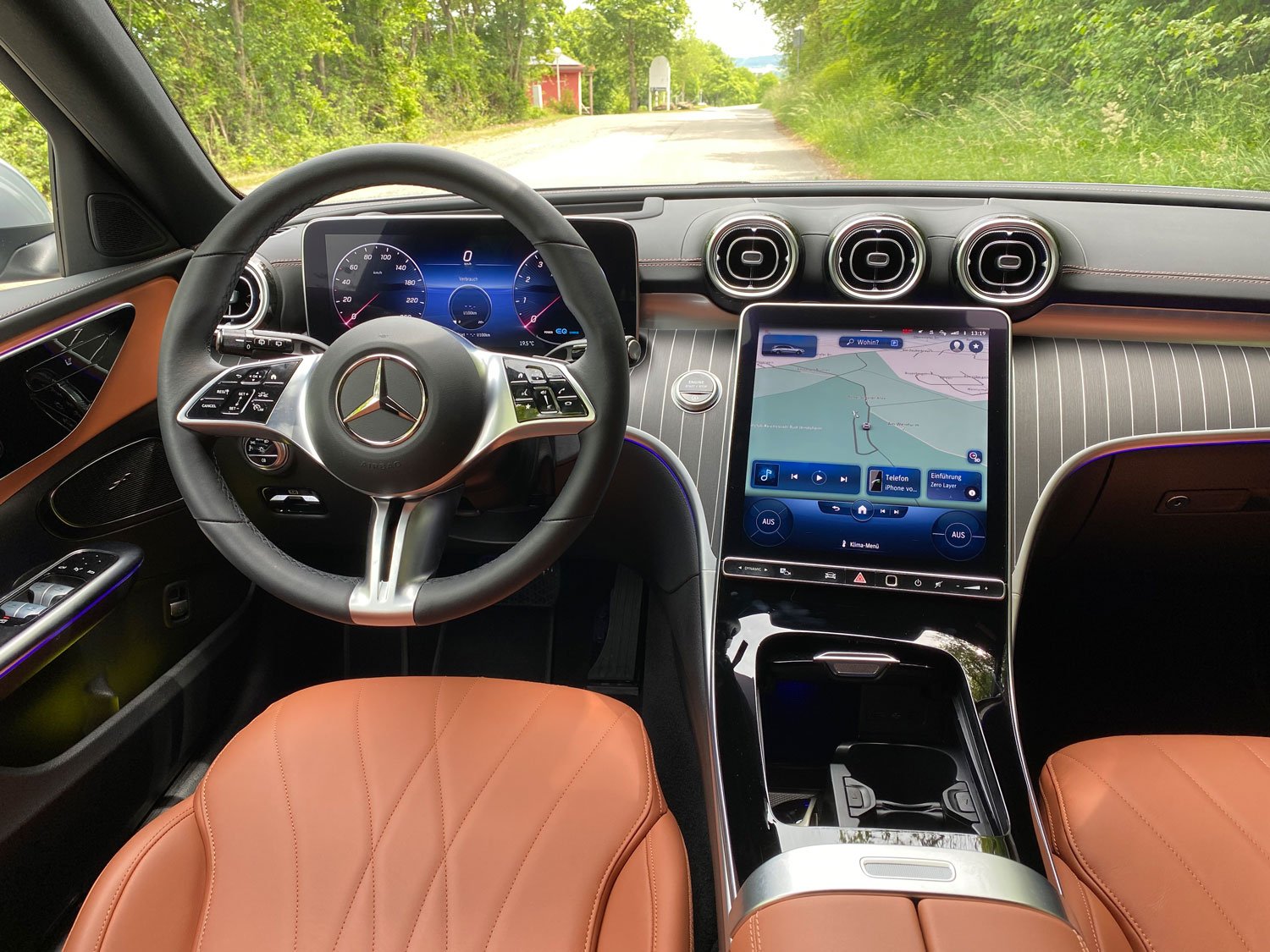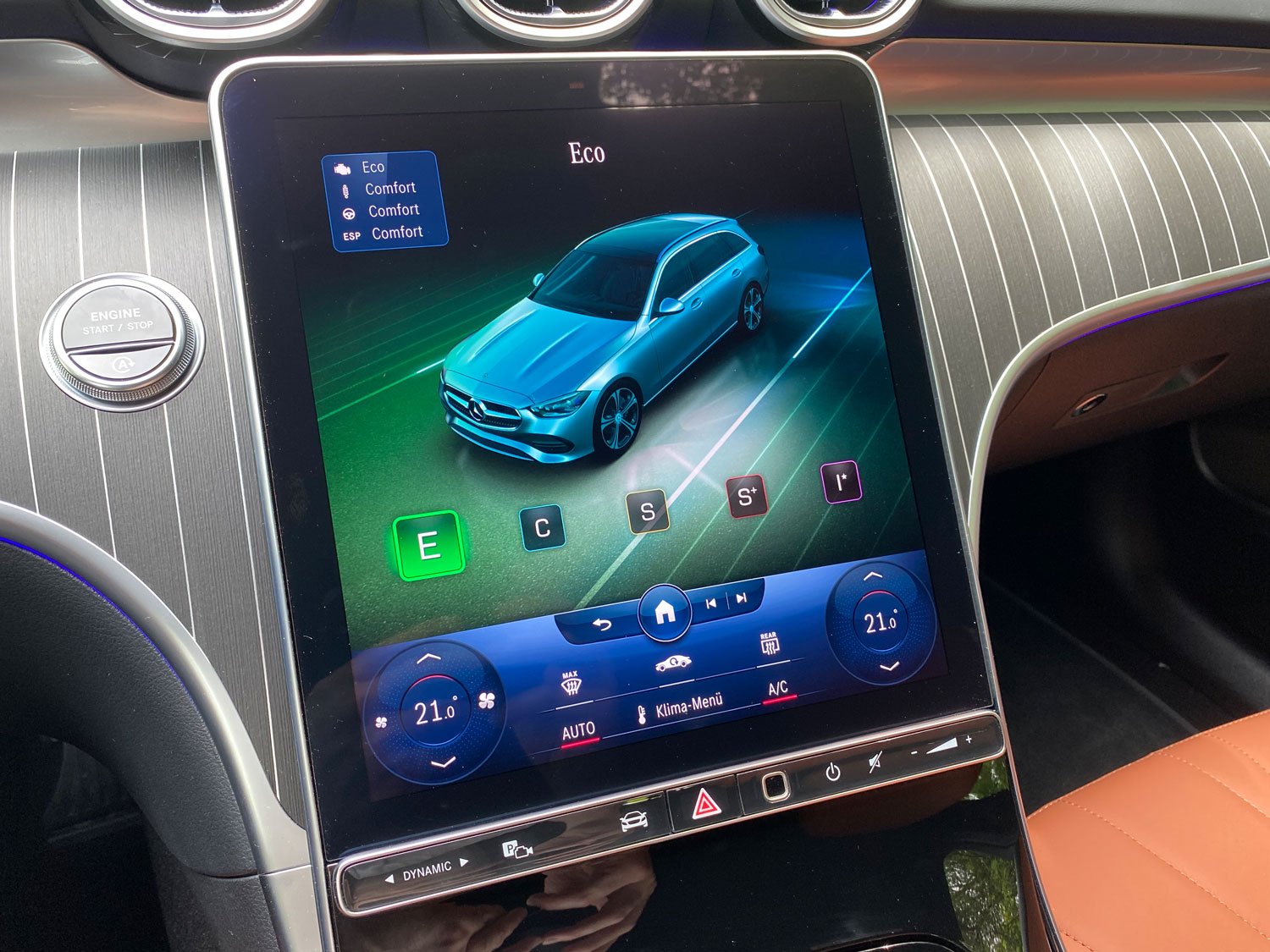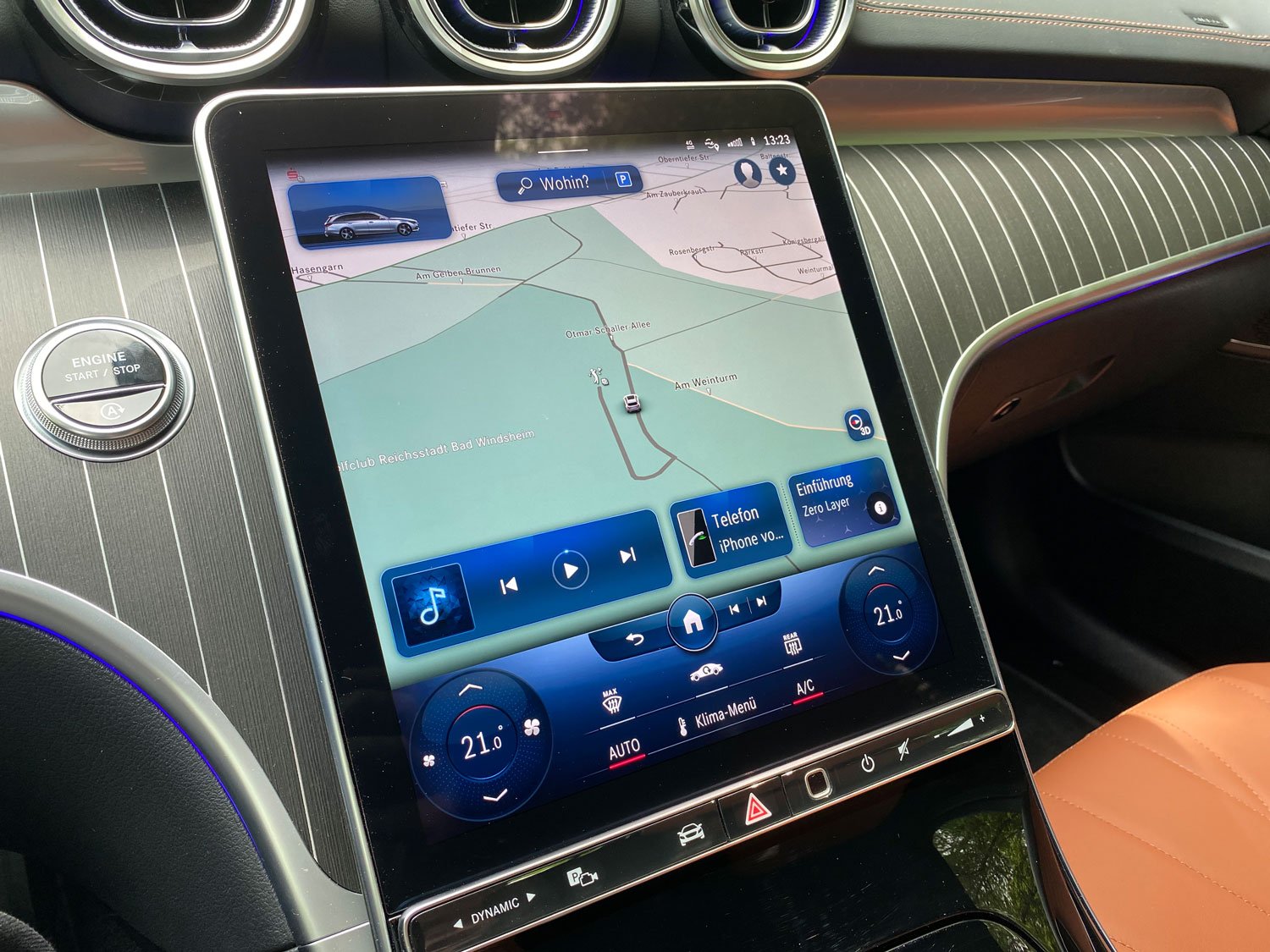 Tiefgreifender verändert hat sich der Innenraum. Das Cockpit erlebte einen Digitalisierungssprung und wird nun dominiert von einem zentralen hochauflösenden Display, das leicht zum Fahrer geneigt ist. In unserem Testwagen war die größere der beiden verfügbaren Versionen mit 11,9 Zoll Bildschirmdiagonale verbaut (im Paket ab 1.309 Euro). Die zweite Generation des Infotainmentsystems MBUX bringt nun Flair der S- in die C-Klasse. Unschöner Nebeneffekt solch großer Monitore und glänzender Flächen rundherum: Jede Fingerberührung erzeugt einen leicht fettigen Abdruck.