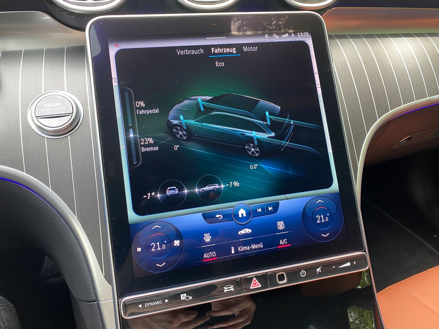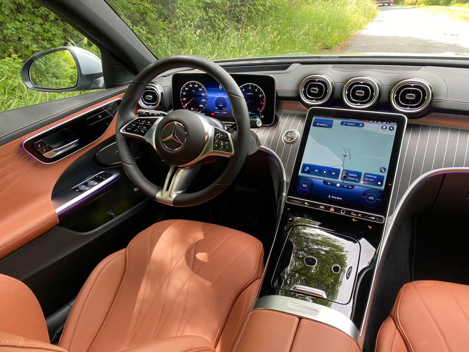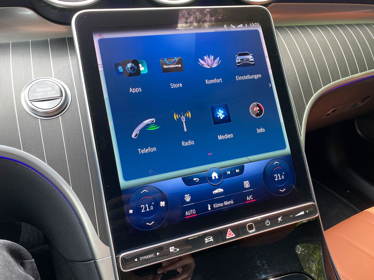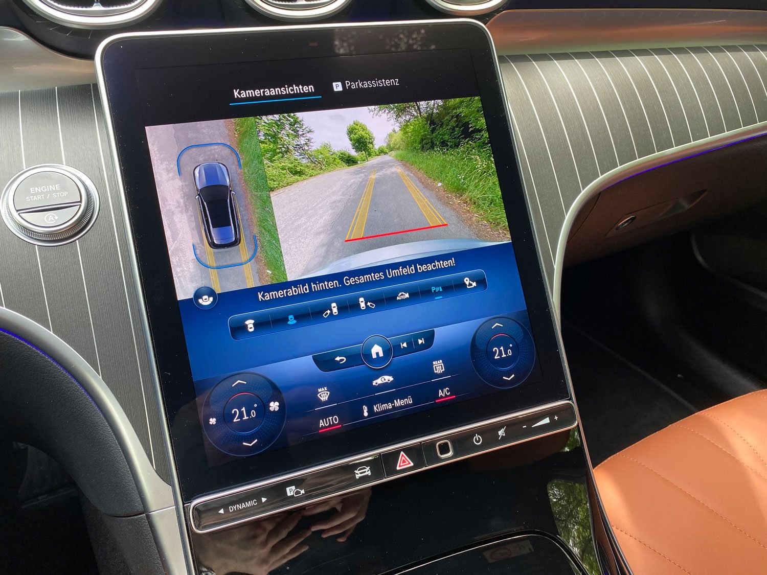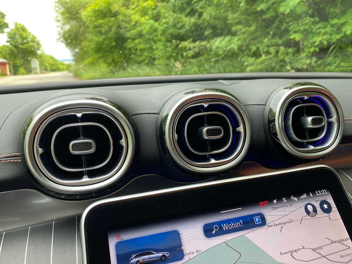 Tiefgreifender verändert hat sich der Innenraum. Das Cockpit erlebte einen Digitalisierungssprung und wird nun dominiert von einem zentralen hochauflösenden Display, das leicht zum Fahrer geneigt ist. In unserem Testwagen war die größere der beiden verfügbaren Versionen mit 11,9 Zoll Bildschirmdiagonale verbaut (im Paket ab 1.309 Euro). Die zweite Generation des Infotainmentsystems MBUX bringt nun Flair der S- in die C-Klasse. Unschöner Nebeneffekt solch großer Monitore und glänzender Flächen rundherum: Jede Fingerberührung erzeugt einen leicht fettigen Abdruck.