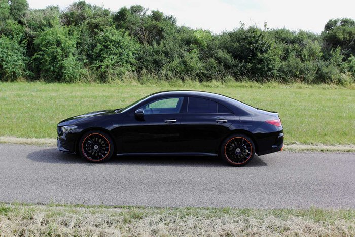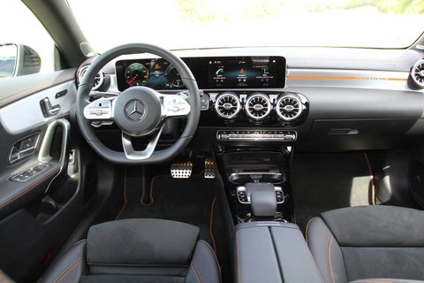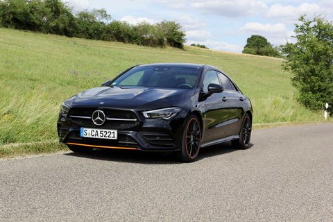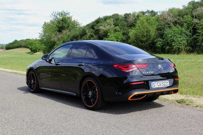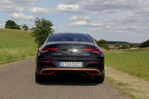 Der Tradition der Marke folgend, ähnelt der CLA stilistisch dem viertürigen Oberklasse-Coupé CLS. Unser Testwagen namens CLA 250 4Matic Coupé basiert als Sondermodell Edition 1 auf dem Exterieur der AMG-Line und ist in sattem Schwarz mit orangen Farbakzenten an Stoßfängern, Rädern, Cockpit, Sitzen und Fußmatten zu erkennen. Diese Farbkombination scheint vor allem junge Menschen anzusprechen.