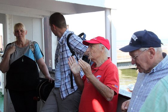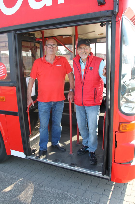 Jetzt war es an der Zeit, den Weg über Schiff, Gangway, Plattform der Alten Liebe, vorbei am Windsemaphor zum Stadtrundfahrtenbus. Nach der Begrüßung durch den Busfahrer Egon Totz und dem Reisebegleiter Ulli Drinkewitz konnten sich die Mitreisenden einen Logenplatz im Schatten, vorwiegend auf dem teilweise überdeckten Oberdeck, auswählen, da der OC Aller-Weser den CUXLINER für sich arrangiert hatte.