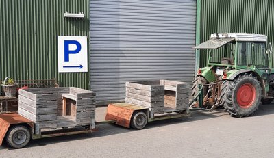 Für die Gruppe war nicht zu übersehen, dass ein Traktor mit vielen „fahrbaren Obstkisten-Anhängern“ für die Besichtigungstour zum Start bereit stand.
