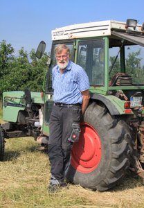 Kurz darauf begrüßte uns der Obstbauer Herr Feindt und gab erste Hinweise für die Besteigung der einachsigen Wagen in einer langen Kette mit dem Traktor vorne weg. Ferner erläuterte er der Gruppe den Führungsablauf und das weitere Verweilen auf dem Obsthof. Der Traktor mit Herrn Feindt setzte sich in Bewegung und im Nu waren wir mit dem Hofexpress umgeben von tausenden Obstbäumen in der großen und weitläufigen Obstplantage und konnten schon während der gemütlichen Fahrt durch die Obstbauflächen verschiedene Obstsorten erkennen. Plötzlich lichtete sich die Dichte des Obstbaumbestandes und der „Expressfahrer“ fuhr mit seinem langen Gespann fast einen Vollkreis, um in dieser Fahrpause den OC-Mitgliedern viel Wissenswertes über den Obsthof in Verbindung mit den vielfältigen Arbeiten in den großen Obstbauflächen zu vermitteln. Die sehr interessant vorgetragenen Informationen reichten von Details aus der Familientradition über die Entwicklung zum heutigen Obstbaubetrieb, bis hin zur Auswahl der Obstsorten, der Jahrespflege, Schädlingsbekämpfung, Bewässerung, Frostschutz, Ernte und der Direktvermarktung. Auch über die hofeigene Lagerung und die Vermarktung im Hofladen gab es sehr viel Interessantes zu erfahren.