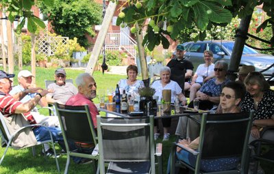 Mit viel Fachwissen im „Gepäck“ endete die sehr interessante Tour mit dem Hofexpres in der Nähe des Hofcafes. Die Reisegruppe konnte direkt nach dem Ausstieg die bereits gedeckte Kaffeetafel einnehmen und bei Kaffee, Tee und selbstgebackenem Kuchen gab es ausreichend Gelegenheit, sich über das Leben und Arbeiten auf einem Obsthof auszutauschen. Nach der gemütlichen Kaffeepause verlagerte die Gruppe ihren Sitzplatz vom Hofcafe auf eine groß angelegte Rasenfläche mit teilweise großen, schattenspendenden Bäumen. Schnell wurde eine große Runde aus vorhandenen Gartenstühlen und Tischen unter dem großen Walnussbaum aufgestellt. Bei kühlen Getränken im natürlichem Schatten konnten wir das Verweilen auf dem wunderschönen Obsthof noch ein wenig genießen. Auch der Hofladen gehört zum Besitz des in siebter Generation betriebenen Obsthofes im Alten Land.