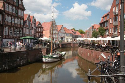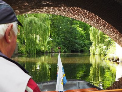 Das Boot setze sich in Bewegung. Nach dem Erreichen des Burggrabens und der großzügigen Überquerung der Schwinge gab es die Fortsetzung vom Burggraben. Als Ergänzung zum Stadtrundgang erhielten wir vom Schipper viele interessante Erläuterungen von den der Stadt umgebenden Häfen und der Stadt durchfließenden Schwinge. Mit den vielen ergänzenden Informationen konnte der Kahn-Kapitän den Entdeckertag von der Wasserseite in und um Stade bestens abrunden.