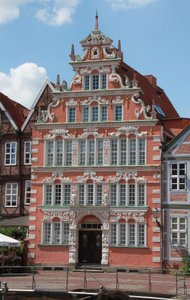 Eines der prachtvollsten Gebäude am Hansehafen (Straße Wasser West) ist das Bürgermeister-Hintze-Haus. Ein Gebäude, das mit seinem kunstvoll geschweiftem Giebel im Stil der Weserrenaissance errichtet wurde.