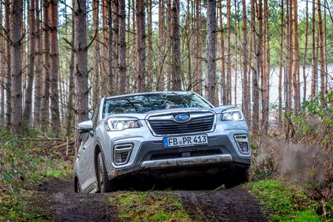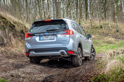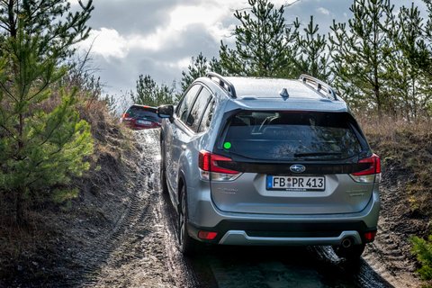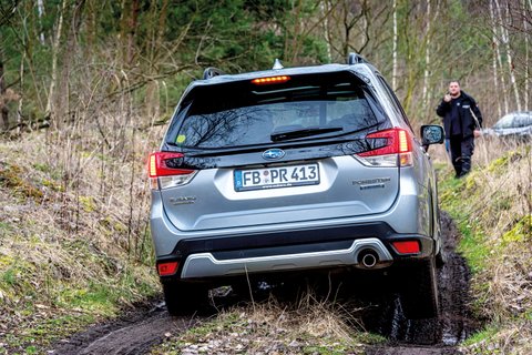 Am besten aber ist der Forester im Gelände, wenn Fritz-Walter-Bedingungen herrschen. Wo man sich zu Fuß auf regendurchtränktem Grund nur mühsam auf den Beinen hält, wühlt sich der Wagen mit beeindruckender Traktion durch Matsch und Schlamm – und macht selbst vor rutschigen Steigungen nicht Halt. Das Allradsystem X Mode ist stets hellwach und verteilt das Drehmoment spontan genau dorthin, wo es gebraucht wird.