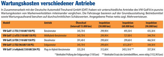 Wer vor dem Autokauf einen Anhaltspunkt haben will, mit welchen Wartungs- und Reparaturkosten im Laufe der Haltedauer zu rechnen sein könnte, dem sei die Reparaturkosten-Kalkulation der Deutschen Automobil Treuhand GmbH (DAT) empfohlen. Richtwerte erteilt auch das Kfz-Gewerbe.