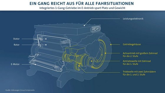 Außerdem scheint der Begriff des Getriebes nicht zu verschwinden. Immerhin ist die Rede vom Eingang-Getriebe, mit ein paar Rest-Zahnrädern. Nur noch ein Gang? Ja, wie das Beispiel VW ID.3 zeigt. Hier ist ein Eingang-Getriebe mit zwei Stufen im Einsatz. Zum Rückwärtsfahren wird nur die Drehrichtung des elektrischen Antriebs umgekehrt. Da beim E-Antrieb anders als beim Verbrenner das maximale Drehmoment sofort und über einen weiten Bereich konstant bereitsteht, gilt ein Getriebe mit mehr Stufen als verzichtbar.