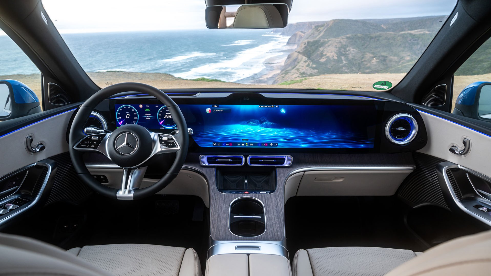 Das MBUX-System der neuesten Generation läuft ruckelfrei und in bestechender Auflösung – doch das Ablenkungspotenzial für den Fahrer steigt mit dem Anwachsen des Bildschirms weiter an. Angenehm: Auf dem Multifunktionslenkrad feiern ein Wippschalter (für den Abstandstempomat) und eine Drehwalze (für die Lautstärke) ihre Renaissance und bilden einen Gegenpol zu den berührungsempfindlichen Tasten und Flächen.