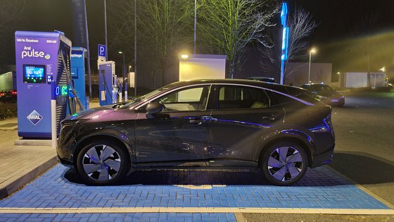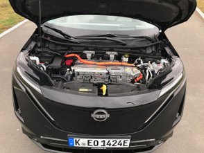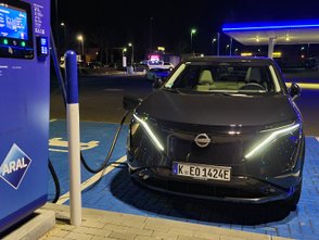 Bei kalten Witterungsbedingungen wie im Testzeitraum konnte eine dreistellige Zahl aber nicht realisiert werden. Ohne Vorkonditionierung des Akkus, für das die Aktivierung einer Funktion in den Tiefen des Infotainmentsystems notwendig ist, kamen wir bestenfalls auf etwa 55 kW. Mit Vorkonditionierung stieg die Ladeleistung bei Temperaturen an der Null-Grad-Grenze kurzfristig auf etwa 80 kW an. Knackpunkt ist die Akku-Temperatur. Fällt diese zu niedrig aus, regelt das Batteriemanagement die Ladeleistung herunter, um dauerhafte Schäden der Zellen zu vermeiden. Ladestopps verlängern sich dadurch im Winter aber deutlich. Bei der Reichweite verspricht Nissan 403 Kilometer – mehr als 300 waren bei uns aber nicht drin.