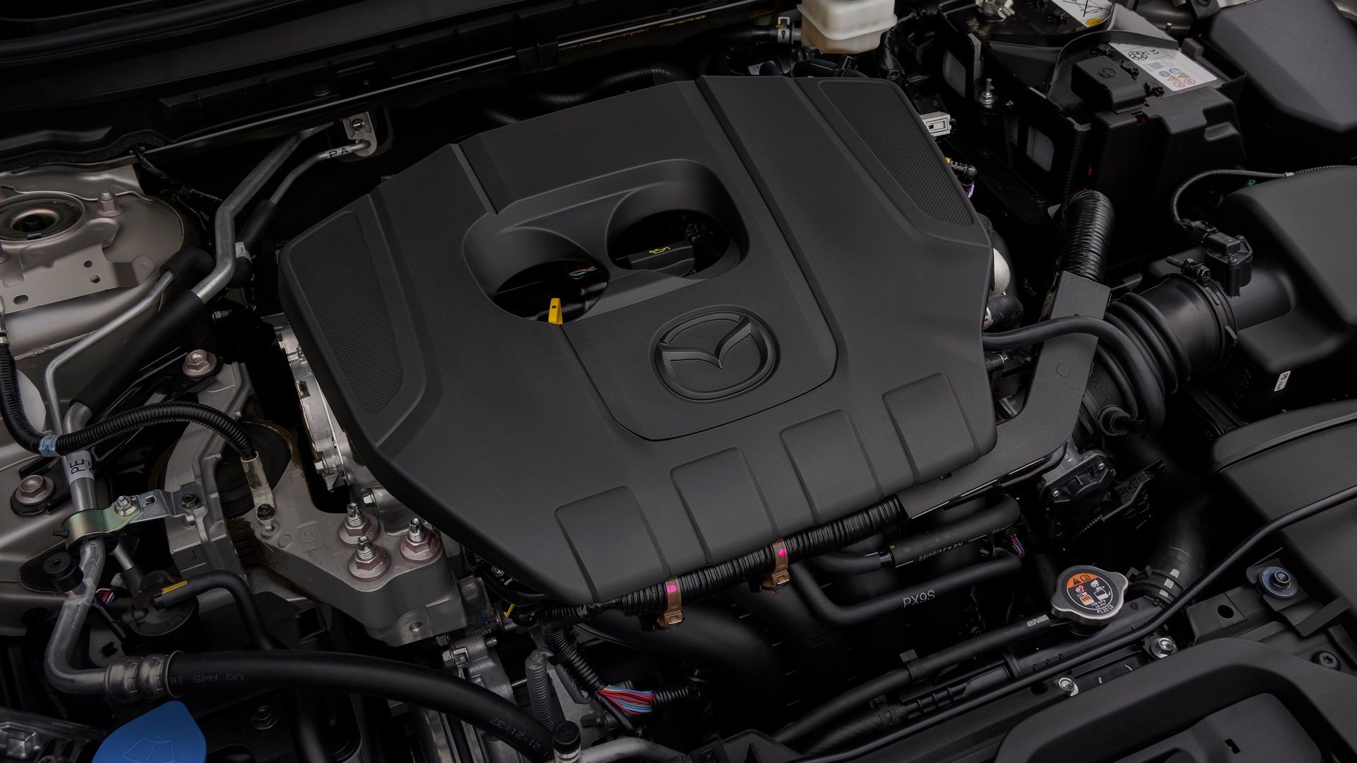 Für das Modelljahr 2025 hat Mazda dem CX-30 mit dem e-Skyactiv G 140 einen neuen Basismotor spendiert. Statt des bisherigen 2,0-Liter-Saugbenziners mit 90 kW/122 PS oder 110 kW/150 PS fährt die Basisvariante nun mit einem 2,5-Liter-Vierzylinder-Benziner mit 103 kW/140 PS vor. Der Motor arbeitet mit einem Mildhybridsystem auf 24-Volt-Basis zusammen. Dessen riemengetriebener Startergenerator speichert beim Bremsen Energie in einem kleinen Akku (0,22 kWh) und unterstützt den Verbrenner besonders beim Anfahren und bei mittleren Drehzahlen mit bis zu 5,1 kW und 48 Nm.