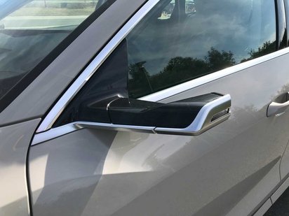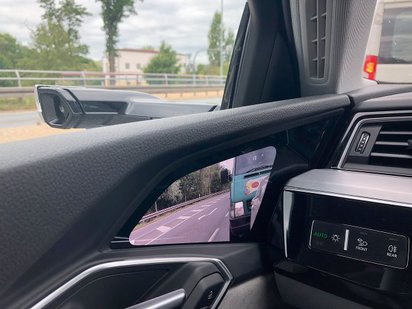 Technischer Vorteil der Kamera: Sie kann im Gegensatz zu einem Rückspiegel einen größeren Teil des Fahrzeugumfelds erfassen und dadurch tote Winkel reduzieren. Verglichen mit herkömmlichen Außenspiegeln stehen die Kameras zudem weniger großflächig im Wind, was dem Kraftstoffverbrauch etwas zugutekommen soll. Bei dem von uns gefahrenen Testwagen, einem Audi e-tron, fallen die sieben Zoll großen Monitore (150 x 94 mm) im Innenraum kleiner als die üblichen Außenspiegel (180 x 125 mm) aus. Die Monitore verfügen über eine automatische Helligkeitsregelung je nach Sonneneinstrahlung und Dunkelheit. Zudem gibt es eine Annäherungssensorik. Bewegt der Fahrer den Finger auf die Oberfläche des Touchdisplays zu, erscheinen Symbole, mit denen er den Bildausschnitt per Fingertipp verschieben kann. Per Umschaltfunktion lässt sich das Display auf der Beifahrerseite auch von der Fahrerseite aus einstellen.