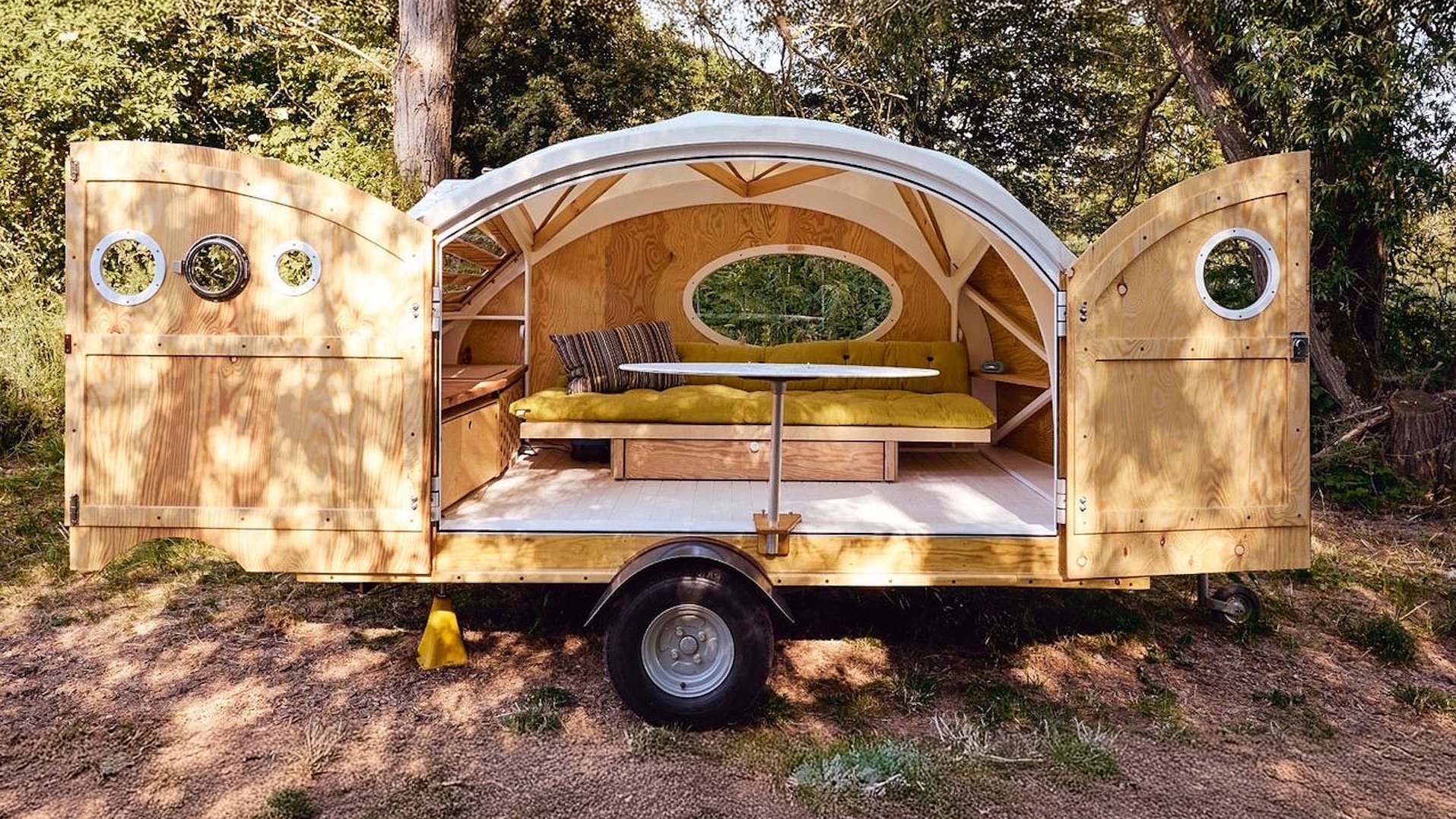 Mit reichlich Holz und abnehmbarem Cabrio-Dach kommt der kompakte Wohnwagen Roomy. Er ruht auf einem ungebremsten Plattform-Anhänger und passt mit einer Länge von 480 Zentimetern (Breite 176 cm, Höhe 199 cm) sogar in eine Garage. Je nach Ausstattung wiegt Roomy nur 440 bis 480 Kilogramm. Dank Flügeltüren lässt sich der Camper seitlich weit öffnen. Tagsüber dient ein multifunktionales Bett als Sofa, nachts wird es zum zwei Meter langen Bett mit 70 bis 140 Zentimetern Breite. Zwei Versionen sind lieferbar: Der Travel (ab 16.490 Euro) als Basisvariante, ergänzt durch den Roadrunner (ab 18.990 Euro). Der bietet einen mobilen Küchenblock aus Birkenholz mit Gaskocher und Kompressor-Kühlschrank, Bettkasten, Lithium-Ionen-Akku und Solarpanel.