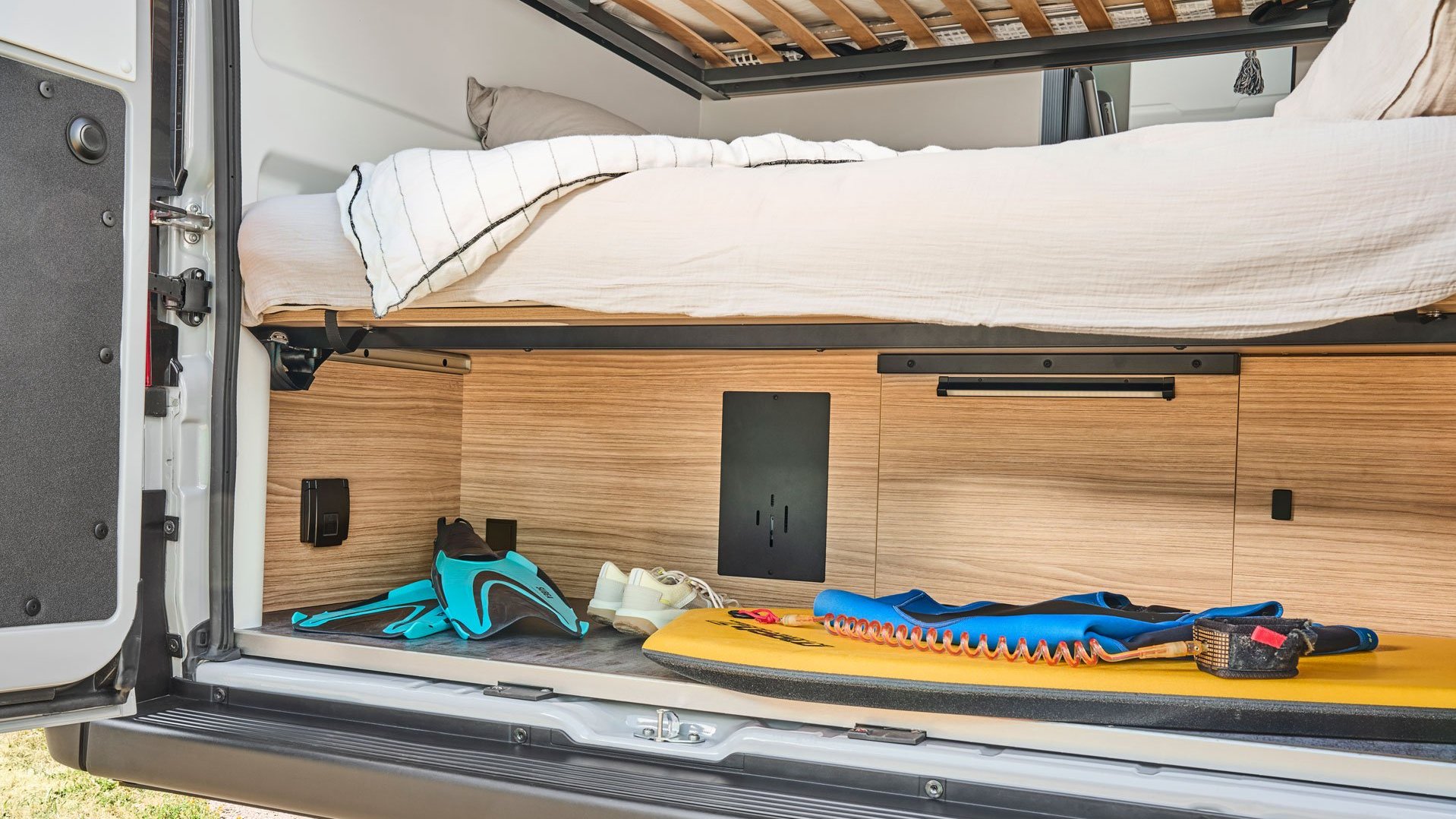 Beim französischen Hersteller Pilote offeriert man mit dem 636 Zentimeter langen V630S einen familientauglichen Kastenwagen-Ausbau mit pfiffiger Bettenlösung. Die Etagenbetten können je nach individuellen Bedürfnissen genutzt werden – etwa als Einzelbetten, als Doppelbett oder als zwei übereinanderliegende Schlafflächen. Statt herkömmlicher Hängeschränke gibt es herausnehmbare Aufbewahrungskoffer, die zu Hause gepackt und im Fahrzeug befestigt werden. Der Heckstauraum unter den Liegeflächen bietet (bei hochgeklappten Betten) mit Verzurrösen Platz für Fahrräder oder E-Scooter. Das Bad kann dank beidseitiger Rollschiebetür komplett geöffnet werden und bietet eine Duschkabine. Mit an Bord: Eine Küche und eine Sitzgruppe für vier Personen.
