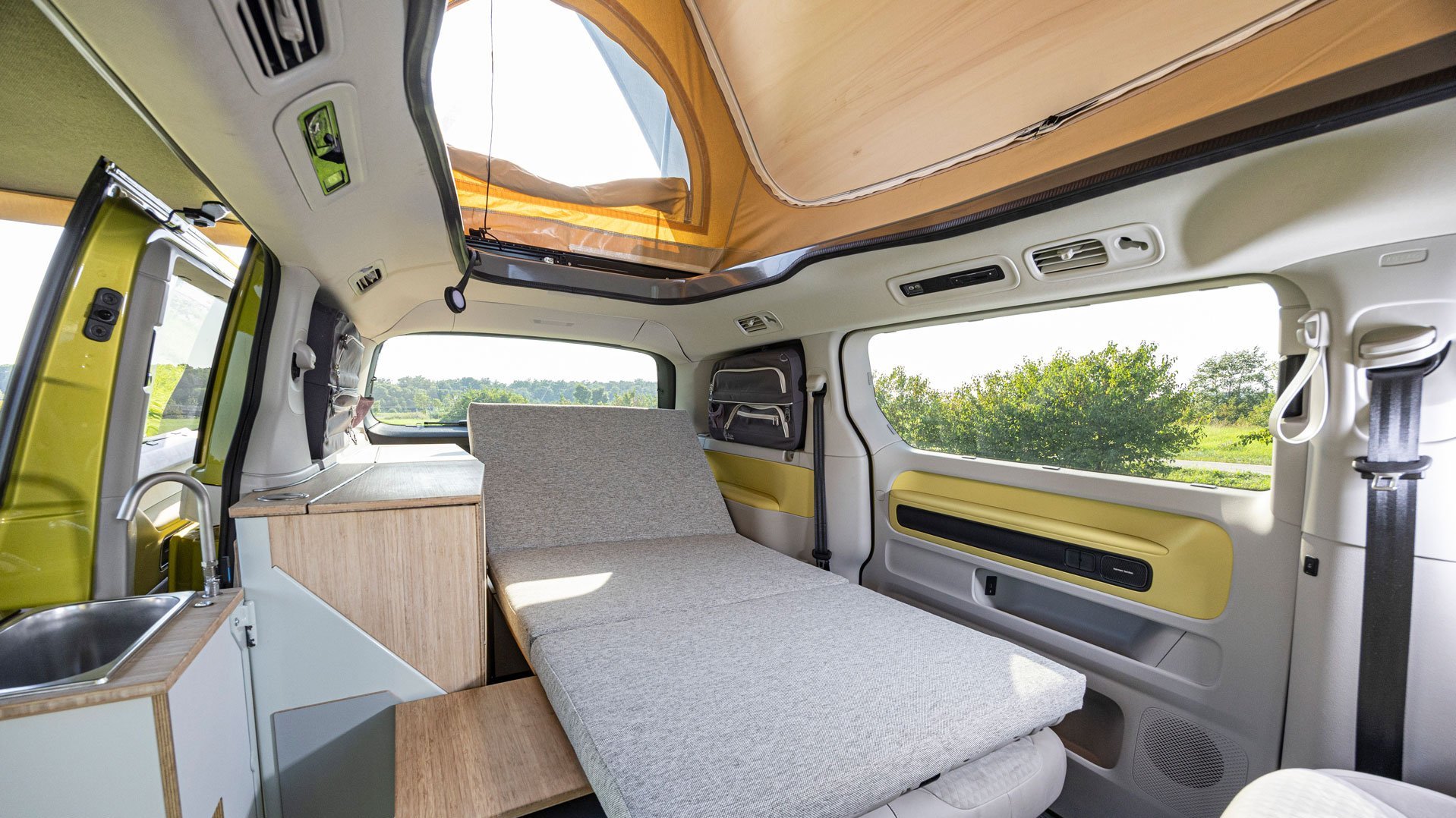 Außergewöhnliche Neuheit aus den Niederlanden: Tonke stattet den VW ID.Buzz mit einem zur Seite hin öffnenden Aufstelldach aus, dazu gibt es eine nach außen schwenkbare Küche und ein Relaxbett. Das seitlich ausklappbare Hubdach ist eine Eigenentwicklung der Niederländer. Es bietet Stehhöhe, eine Markise und ein Bett mit 135 x 210 Zentimeter großer Liegefläche im „ersten Stock“. Das atmungsaktive Zeltgewebe aus TenCate-Stoff reguliert Feuchtigkeit auf natürliche Weise und schafft so ein angenehmes Raumklima. Ausgestattet ist der Explorer mit einem Induktionskochfeld mit zwei Kochstellen, einem 36 Liter fassendem Kühlschrank, einem Einzelbett (90 x 200 cm) unten sowie einem zehn Liter fassenden Frisch- und Abwassertank.