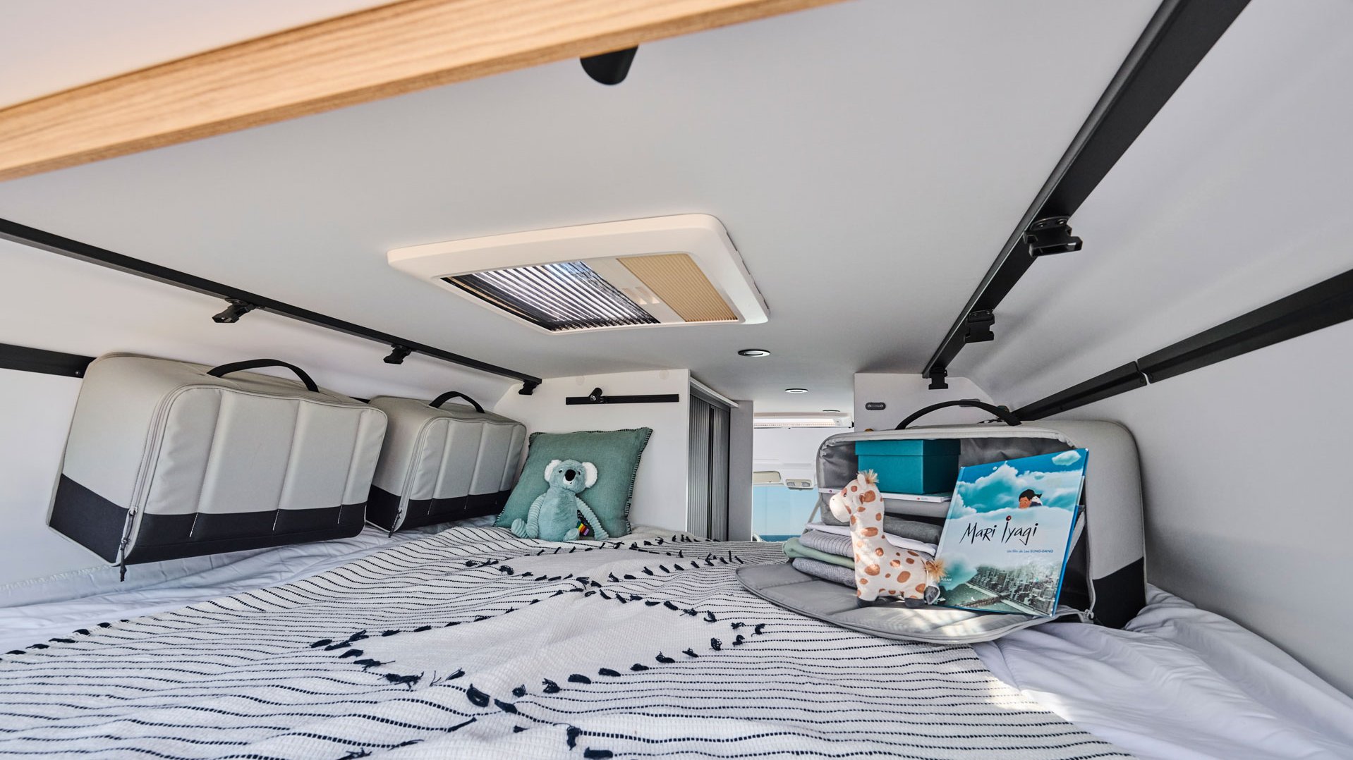 Das Querbett ist mit Holzlattenrost und Ergonomy-Matratze ausgestattet. Serienmäßig sind zwei Schlafplätze, mit optionalem Aufstelldach und einem dritten Bett in der Dinette können bis zu fünf Schlafplätze realisiert werden.