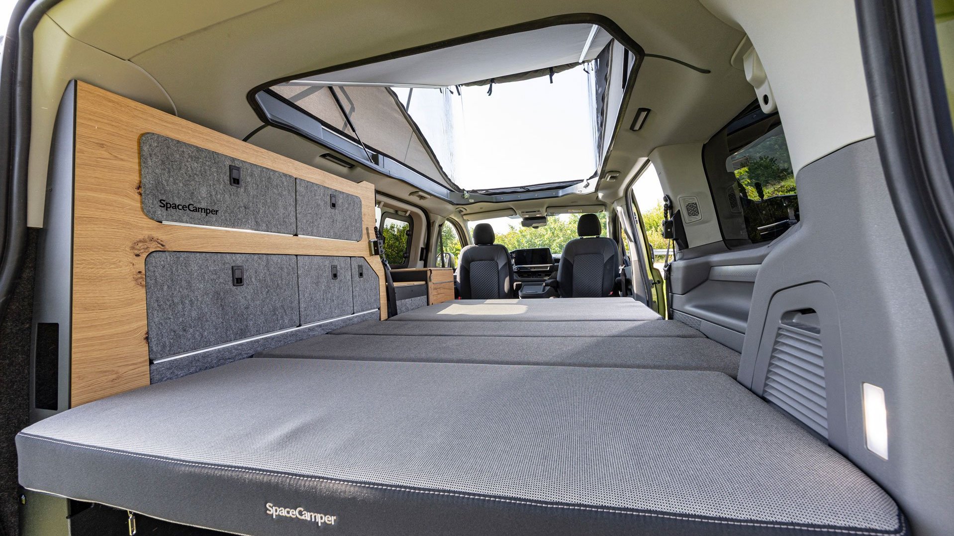 Auf die Pkw-Variante des neuen VW Transporters, des New Caravelle, setzt Spacecamper mit seinem fünfsitzigen Classic+. Die Karosserie des 505 Zentimeter langen neuen Caravelle ist breiter als beim Vorgänger (203 cm) und wird mit zwei Schiebetüren geliefert. Spacecamper nutzt den Raum für seine bewährte Sitz-/Schlafbank und seine flexible Küche. Die Dreier-Sitzbank wurde überarbeitet und ist jetzt noch leichter zur Liegefläche umbaubar. Zur Seite falten lässt sich der neue Klappschrank, so wird die zwei Meter lange Liegefläche mit einem Zusatzpolster bis zu 140 Zentimeter breit. Ebenfalls modifiziert ist das aufstellbare Schlafdach. In geschlossenem Zustand bleibt der VW unter der magischen Grenze von zwei Metern Höhe. Zwei Personen finden oben Platz für die Nacht.