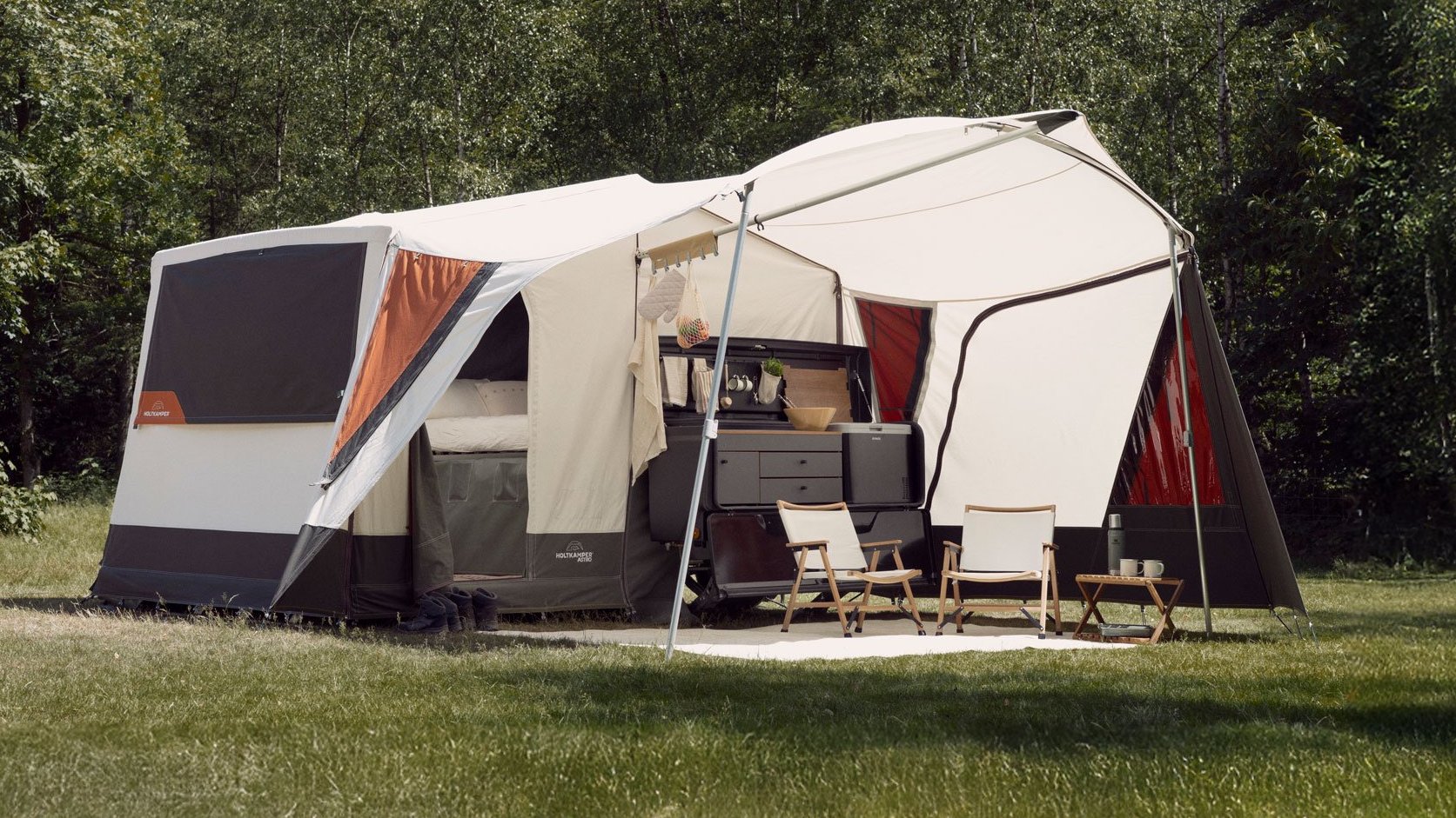 Neu entwickelt hat Holtkamper, bekannt für Faltcaravans, seinen Astro. Er soll in gerade mal sechs Minuten vollständig aufgebaut sein. Der Astro ist vollständig modular entworfen. Camper starten mit einem soliden Basismodell, das je nach Wunsch mit Vorzelt, Seitenwänden, Küche und/oder einem Kinderschlafzelt erweitert werden kann. Damit taugt der Astro für unterschiedliche Campingbedürfnisse, vom Alleinreisenden bis zur Familie.
