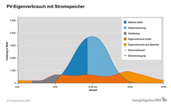 Durch die Installation eines Batteriespeichers lässt sich der Eigenverbrauch steigern, indem Haushalte insbesondere morgens und abends auf den gespeicherten Solarstrom zurückgreifen können. Um die Speicherkapazität festzulegen, empfiehlt die Energieagentur NRW, diese am Kilowattpeak der Anlage auszurichten. So erreicht ein Durchschnittshaushalt mit einer fünf kWp großen PV-Anlage mithilfe eines fünf Kilowattstunden-Batteriespeichers einen Eigenverbrauchsanteil zwischen 55 und 60 Prozent. Ein höherer Anteil lohne sich dagegen oft wirtschaftlich nicht, da dazu ein zu großer Speicher notwendig wäre. Die Nettopreise für Speichersysteme liegen je kWh zwischen 600 und 1500 Euro.
