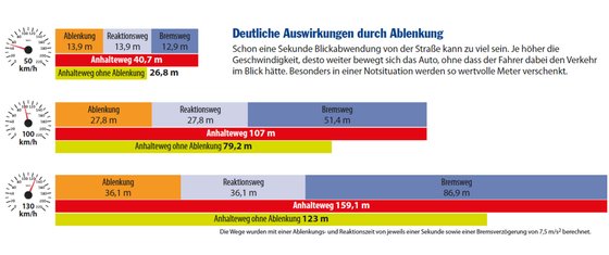 Aus Folgen von Ablenkung können Wahrnehmungs-, Entscheidungs- und Handlungsfehler sowie schließlich Fahrfehler resultieren. Das nutzbare Sehfeld und die bewusste sowie unbewusste Wahrnehmung werden eingeschränkt. Autofahrer richten ihren Blick auf die Fahrbahnmitte beziehungsweise den vorausfahrenden Wagen. Spurhaltung, Geschwindigkeitskontrolle und Abstand verschlechtern sich, das Sicherungsverhalten durch Kontroll- und Orientierungsblicke bleibt aus, schlussendlich werden kritische Situationen zu spät erkannt. Laut der Deutschen Gesellschaft für Verkehrspsychologie ist die Ablenkung durch fahrfremde Tätigkeiten ein aufmerksamkeitsbeeinträchtigender Prozess, der die menschliche Informationsverarbeitungskapazität an die Ressourcenerschöpfung führen kann. Demnach sind vor allem Fahranfänger davon betroffen, da sie noch keine automatisierte Handlungsroutine aufweisen. Aber: „Auch ältere Autofahrer fühlen sich in Situationen mit vielen Reizen eher überfordert, weil das Sehvermögen und die Leistungsfähigkeit abnehmen“, gibt Müller zu bedenken.