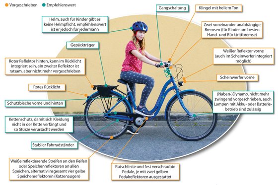 Für Kinderfahrräder gelten – wie für Erwachsenenräder auch – die Regeln der Straßenverkehrs-Zulassungs-Ordnung (StVZO §§ 63 bis 67). Kleinere Kinder sind häufig noch mit sogenannten Spielrädern unterwegs, die diese Vorschriften nicht erfüllen müssen – dafür dürfen sie nicht im Straßenverkehr gefahren werden. Von acht bis zehn Jahren können Kinder wahlweise Gehweg oder Straße und Radweg nutzen (StVO § 2 Abs. 5). Unsere Grafik zeigt, wie das Fahrrad ausgerüstet sein sollte – übrigens auch das von Jugendlichen und Erwachsenen.