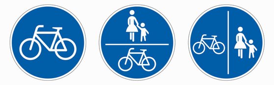 Die Beschilderung entscheidet über Benutzungsrecht und Benutzungspflicht. Radfahrende haben die Pflicht einen Radweg zu nutzen, wenn die Zeichen 237, 240 oder 241 (Bilder unten, von links nach rechts) dies anzeigen. Eine Ausnahme gilt nur, wenn der Radweg nicht benutzbar ist, zum Beispiel aufgrund von Schnee, Blättern oder Hindernissen. Übrigens: Auch Rennradfahrer haben hier eine Benutzungspflicht. Radwege ohne diese Beschilderung sind nicht verpflichtend zu nutzen. Auch linksseitige Radwege müssen befahren werden, wenn eines der genannten Schilder dies vorschreibt. Wege dürfen befahren werden, wenn das Zusatzzeichen „Radfahrer frei“ (1022-10, siehe auch Irrtum Nr. 5) es erlaubt. Auf einem kombinierten Geh- und Radweg (Zeichen 240) müssen Radfahrer ihre Geschwindigkeit den Fußgängern anpassen. Schrittgeschwindigkeit gilt auch, wenn reine Gehwege oder Fußgängerzonen, die sonst grundsätzlich nicht befahren werden dürfen, für den Radverkehr freigegeben sind.