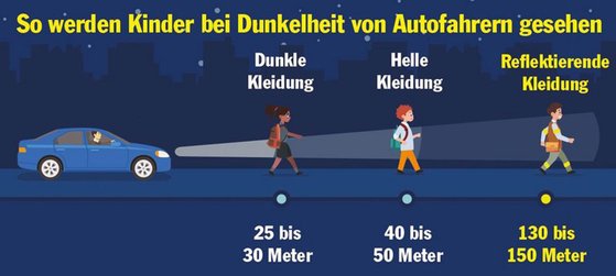 - 1. Bei einer Gefahrenbremsung benötigt ein Auto mit Tempo 50 rund 28 Meter, um zum Stehen zu kommen. Für eine dunkel gekleidete Person kann das bei Dunkelheit schon knapp werden. Der Autofahrer erkennt diese nämlich erst aus einer Entfernung von 25 bis 30 Metern. Zum Vergleich: Ein Mensch mit heller Kleidung ist bereits aus 40 bis 50 Metern sichtbar. Trägt er zusätzlich noch retroreflektierende Elemente am Körper, kann er im Scheinwerferlicht aus 130 bis 150 Metern gesehen werden (s. Grafik).