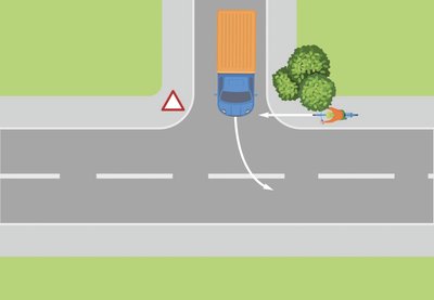 Ein Lkw nähert sich einer kreuzenden, größeren Vorfahrtstraße und möchte nach links abbiegen. Kurz vor der Einmündung verdeckt ein Baum die Sicht auf den Gehweg, der entlang der Vorfahrtstraße verläuft. Dadurch übersieht der Lkw-Fahrer ein Kind, das auf seinem Fahrrad von links kommend auf dem Gehweg unterwegs ist. Beim Abbiegevorgang kommt es zu einer Kollision, bei der das Kind schwer verletzt wird.