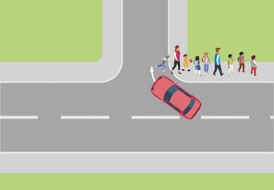 Ein Pkw-Fahrer, der sich auf einer Vorfahrtstraße befindet, möchte nach rechts abbiegen. Auf dem Gehweg entlang der Vorfahrt-straße nähert sich von links eine Kindergartengruppe, die die abzweigende Straße gerade überqueren möchte. Der Autofahrer hält an und wartet, bis die hinten gehende Erzieherin die andere Straßenseite erreicht hat. Er fährt an und biegt ab. Dabei übersieht er ein zweijähriges Kind, das sich aus Sicht des Autofahrers hinter der Erzieherin befunden hat, und erfasst es beim Abbiegevorgang. Das Kleinkind stirbt an seinen schweren Verletzungen.
