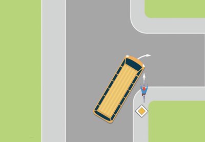 Ein Busfahrer möchte von einer Vorfahrtstraße nach rechts abbiegen. Dabei übersieht er ein Kind, das mit seinem Fahrrad auf dem Gehweg entlang der Vorfahrtstraße fährt und vor dem Überqueren der kreuzenden Straße nicht abbremst. Zum Zeitpunkt der Kollision befindet sich der Radfahrer im Toten Winkel des Busfahrers und wird schwer verletzt.