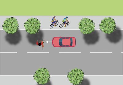 Ein Autofahrer ist auf einer Vorfahrtstraße unterwegs, an der seitlich Fahrzeuge parken. Von rechts kommt ein schnell fahrendes Kind auf seinem Fahrrad aus einer Einmündung und überquert die Vorfahrtstraße, ohne auf andere Verkehrsteilnehmer zu achten. Aufgrund der Sichtbehinderungen sieht der Pkw-Fahrer den Radfahrer zu spät. Bei der Kollision wird das Kind schwer verletzt.
