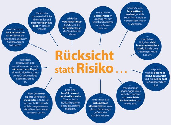 Wer in der Verkehrssicherheitsarbeit etwas bewirken will, kann auch ohne hohe Investitionen viel erreichen – zum Beispiel durch „Rücksicht statt Risiko“! Denn Rücksichtnahme ist vollkommen kostenlos und leistet dennoch einen effektiven Beitrag für mehr Sicherheit auf den Straßen.