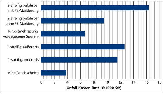 Dennoch: Insgesamt ist die Unfall-Kosten-Rate eines Kreisverkehrs laut Bundesanstalt für Straßenwesen (BASt) in etwa halb so hoch wie an einer signalgeregelten Kreuzung – das zeigt, dass weniger schwere Unfälle passieren. Je nach Art des Kreisels unterscheidet sich die Unfallkostenrate. Ein Minikreisel mit einer für Lkw und Busse befahrbaren Mittelinsel ist beispielsweise sicherer als ein mehrspuriger Kreisverkehr (siehe Grafik Unfall-Kosten-Rate). Bei letzterem kann es laut DVR zu Konflikten beim Spurwechsel kommen.