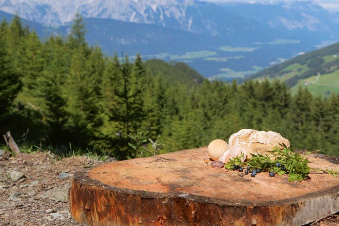 Beim Gasthaus Halsmarter an der Mittelstation grasen zwar keine Kühe, jedes Kind bekommt aber dank der Schatzkarte, wie in der Region Hall-Wattens die Gästekarte genannt wird, kostenlos eine fast handballgroße Holzkugel geliehen (Kaution: 8 Euro). Sie ist aus dem für die Region typischen Zirbenholz gefertigt. Und sie entpuppt sich hier oben auf 1560 Metern Seehöhe als wahrer Schatz, kann man mit ihr auf einem schattigen Gelände im Hochwald doch schier grenzenlose Abenteuer erleben. Für den Kugelwald wurde nämlich in Handarbeit aus Zirbenholz eine riesige, 500 Laufmeter umfassende Kugelbahn gebaut. Sie sorgt mit zahlreichen, teils mannshohen Stationen auf 8000 Quadratmetern für viel Freude bei den kleinen und großen Besuchern. Ein Seillift oder Schrägaufzug bringt den Holzball an den Start.